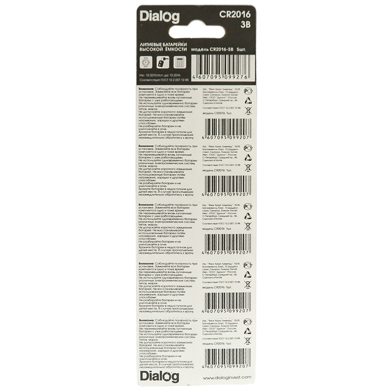 Dialog production :: Lithium batteries Dialog CR2016-5B - Lithium batteries, 5PCs. in blister
