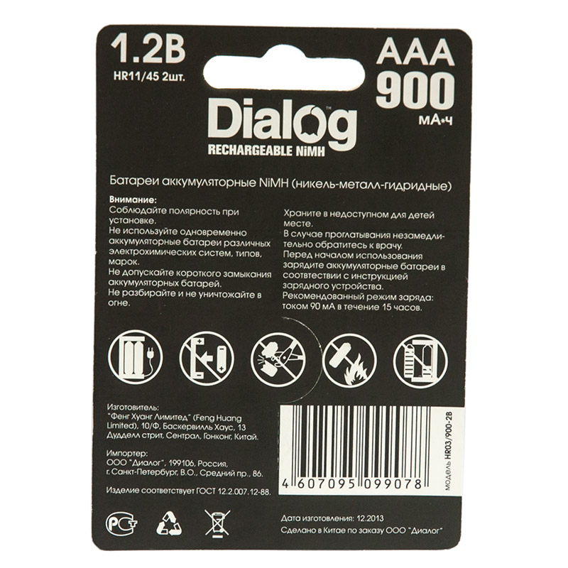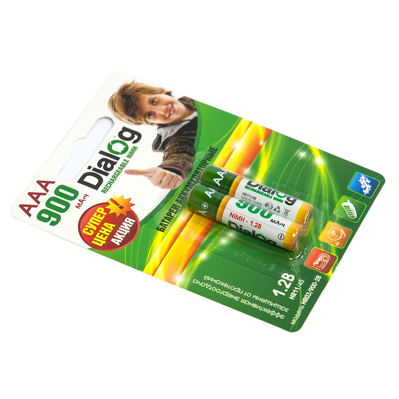 Dialog production :: NiMH rechargeable AAA batteries Dialog HR03/900-2B - NiMH rechargeable AAA batteries, 900 mA*h, 2 PCs. in blister