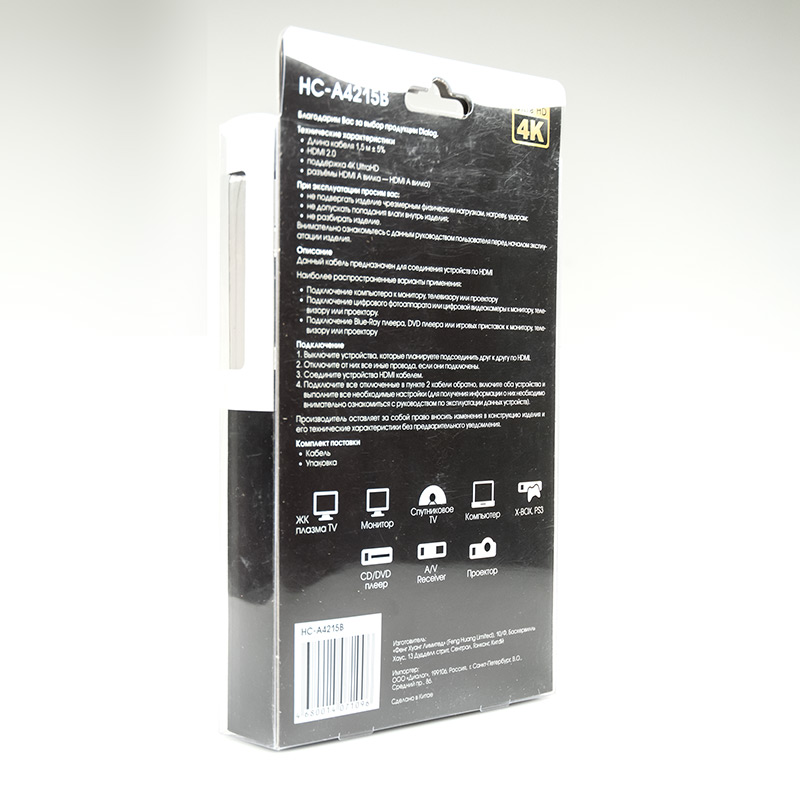 | Model | HC-A4215B | | Cable type | HDMI A - HDMI A (m-m) cable | | Version | HDMI 2.0 | | Connector 1 | HDMI type A, male | | Connector 2 | HDMI type A, male | | Length, m | 1.5 | | Applicability | The cable is designed for connecting devices with HDMI interface, such as 3D/LED/LCD TV, plasma TV, computer monitors, satellite receivers, projectors, game consoles, computers, notebooks, CD/DVD/Blue-Ray players, A/V receivers, etc. Max resolution 4096*2160@60Hz |