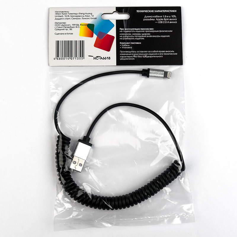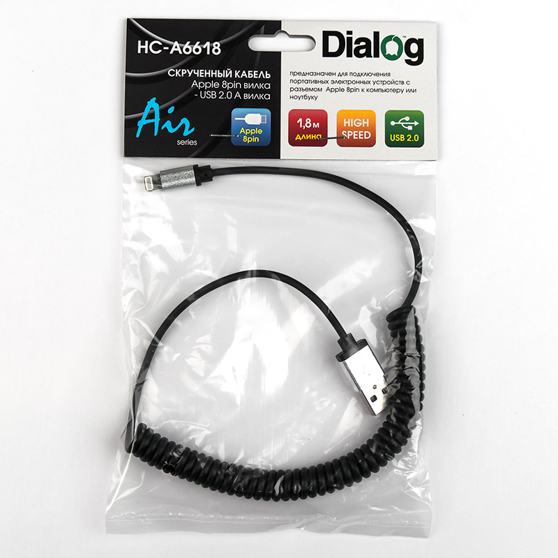 Dialog production :: Spiral cable USB - Apple lightning 1.8m Dialog HC-A6618 - Apple spiral cable 1.8m USB - Apple Lightning 8-pin