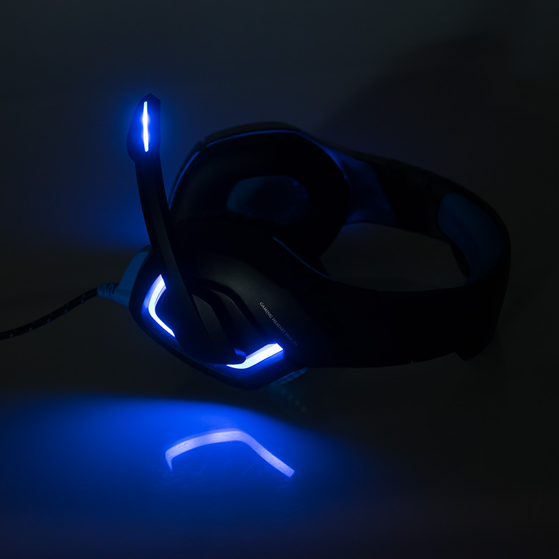 LED blue light on the cups and microphone, activates when when connected to a USB port.