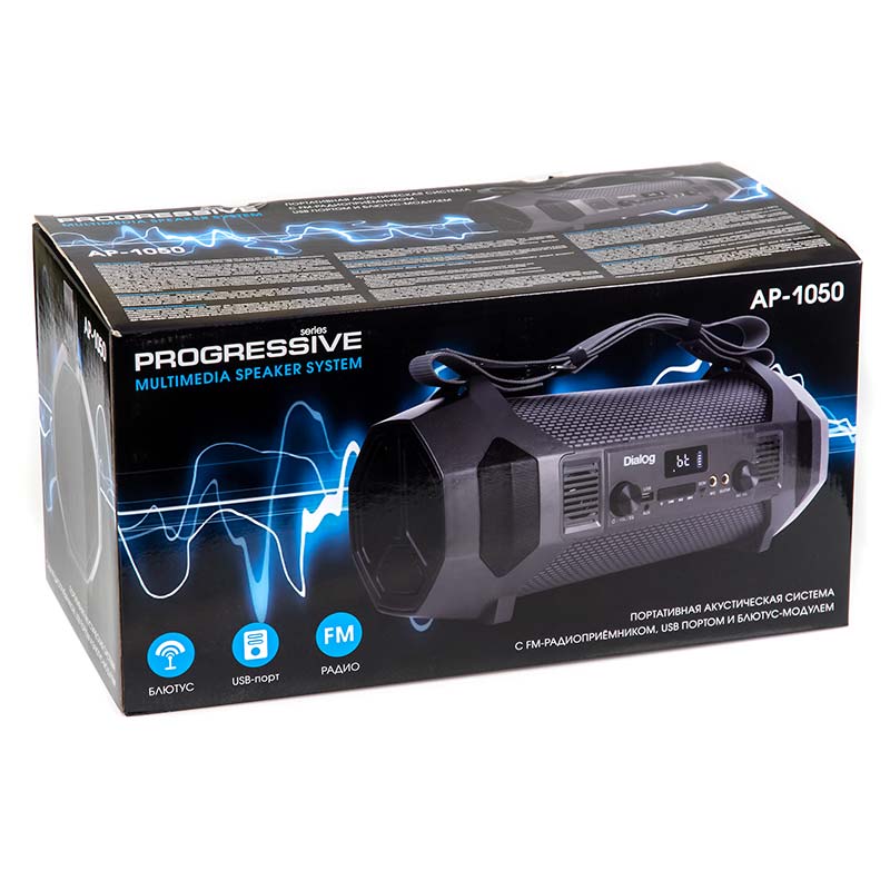 | Model | AP-1050 | | Type | Portable | | Mode | Mono | | Power RMS, W | 24 | | Wireless interface | Yes. Bluetooth v.2.1+ EDR, Class II. A2DP, AVRCP profiles | | TWS mode supported | No | | Battery | Built-in, 3600 mAh | | Yes | | Yes, internal antenna | | Supported file system type and size | FAT16/FAT32, up to 32Gb | | Supported file formats | MPEG-1 Audio Layer 3 (MP3), with 64 - 320 kbps bitrate | | Components | compact outdoor speaker system | | Amplifier | Built-in | | SNR | 58 | | Power suppply | Built-in battery or power from USB (DC 5V / 500 mA) | | Inputs | Line-in AUX (3.5mm stereojack), 2x 6.3mm stereojack inputs (karaoke mic, electro guitar) | | Controls | power on / off; buttons: next track/station, previous track/station, play / pause, mode; knobs: master volule, mic volume | | Indication | LED display on the front panel (luminous characters, dark display) | | Loud speaker(s) | 2*4″ + 2*1.6″ | | Power (W) | 24 | | Impedance (Ohm) | 4Ω | | Frequency range (Hz-kHz) | 100-20 | | Case dimensions (H*L*D, mm) | 420*191*189 | | Carriynd strap | Yes | | Supplied parts | Wireless speaker system with built-in battery, packaging, warranty card, USB power cable |