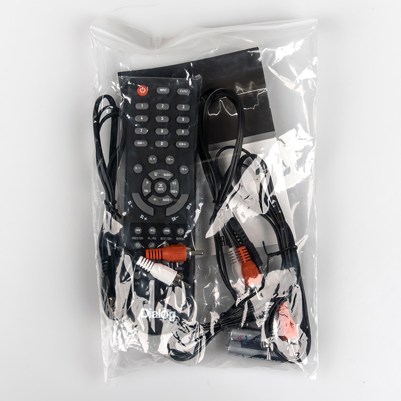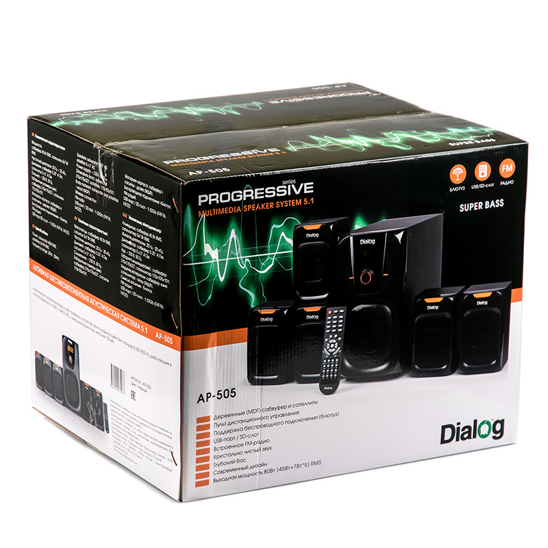 | Model | DIALOG AP-505 | | Power RMS, W | 80 | | Bluetooth support | Yes | | USB support | Yes | | SD card support | Yes. SD, + miniSD & microSD (via adapter - sold separately) | | FM radio | Yes, 20 stations memory | | 5.1 Mode | Yes | | Components | Subwoofer, 2 front satellites, 2 rear satellites, central satellite | | Amplifier | Built-in | | Tuner | FM tuner with autoscan mode, external flexible antenna | | Tuner memory | 20 presets | | Power supply | Built-in | | Inputs | 5.1 input (3*2RCA), AUX (2RCA), FM antenna | | Controls | On rear side: Power switch; Front side: play/pause, next/prev, Mode select | | Remote controller | Full-scale infrared | | Indication | 4-character displpay | | Power cable length (m) | 1.4 | | Subwoofer | | | Loudspeaker(s) | 5.25″ (on front side) | | Power (W) | 45 | | Frequency response (Hz-Hz) | 30-250 | | Loudspeaker(s) material | Textured paper | | Phase inverter | Pipe on left side, D=50mm, L=80mm | | Cabinet | MDF, 9mm | | Grill | Black metallic | | Dimensions (H*W*D, mm) | 315*170*327 | | Weight (kg) | 4,3 | | Front satellites | | | Loudspeaker(s) | 3″ | | Power (W) | 7 | | Frequency range (Hz-kHz) | 200-20 | | Loudspeaker(s) material | paper | | Case | MDF | | Grill | Black metallic | | Overall dimensions (H*L*D, mm) | 170*105*101 | | Weight (kg) | 0.50 | | Detachable cable | no | | Cable length (m) | 1.30 | | Rear satellites | | | Loudspeaker(s) | 3″ | | Power (W) | 7 | | Frequency range (Hz-kHz) | 200-20 | | Loudspeaker(s) material | paper | | Case | MDF | | Grill | Black metallic | | Overall dimensions (H*L*D, mm) | 170*105*101 | | Weight (kg) | 0.50 | | Detachable cable | no | | Cable length (m) | 2.8 | | Central satellites | | | Loudspeaker(s) | 3″ | | Power (W) | 7 | | Frequency range (Hz-kHz) | 200-20 | | Loudspeaker(s) material | paper | | Case | MDF | | Grill | Black plastic | | Overall dimensions (H*L*D, mm) | 170*105*101 | | Weight (kg) | 0.50 | | Detachable cable | нет | | Cable length (m) | 1.30 |