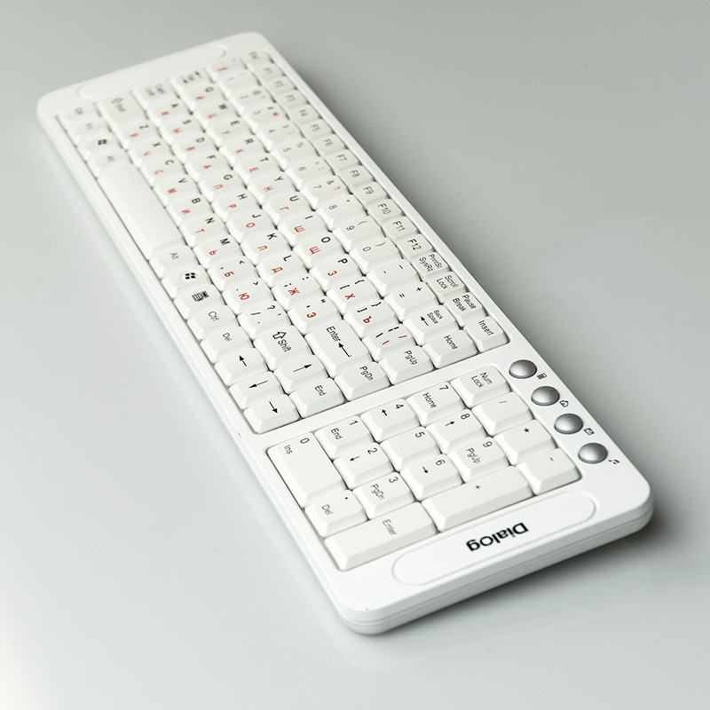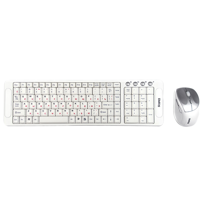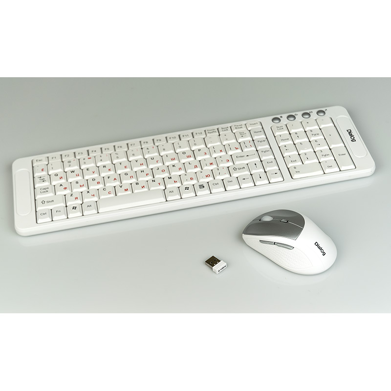 | Model | DIALOG KMROK-0318U White | | Interface | USB | | Wireless | Via 2.4 gHz radio channel | | Keyboard | | | Body | Opaque white body plastic, white keys, red cyrillic, black latin | | Number of keys | 109 | | Windows keys | Yes | | Multimedia keys | Yes | | Batteries type | AAA | | Batteries qty, pcs | 2 | | Adjustable tilt | Self-adhesive rubber semisphere pads | | Supported OS | Any OS with USB HID support (MS Windows etc) | | Overall dimensions (H*L*D, mm) | 415*120*15 | | Weight (kg) | 0.538 | | Mouse | | | Type | Optical (visible spectrum) | | Resolution | 800/1200/1600 | | Dynamically changed resolution | Yes, cycles with "DPI" button | | Body material | plastic | | Number of buttons | 5 | | Scroll wheel | Vertical | | Builtin / removable accumulators | batteries | | Battery type | AAA | | Battery quantity | 2 | | Overall dimensions (H*L*D, mm), max | 100*64*35 | | Net weight, g | 62 |