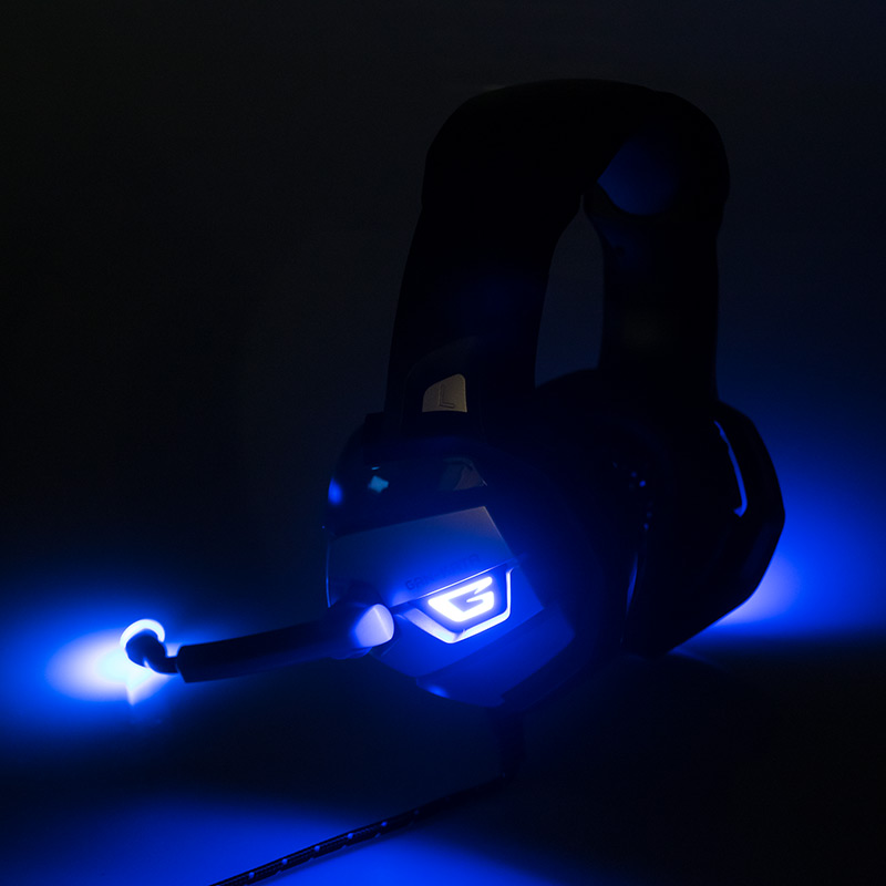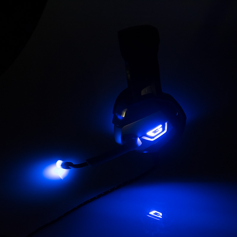 LED blue light on the cups and microphone, activates when when connected to a USB port.