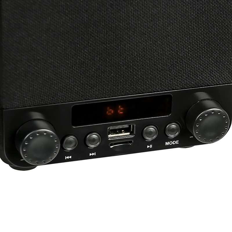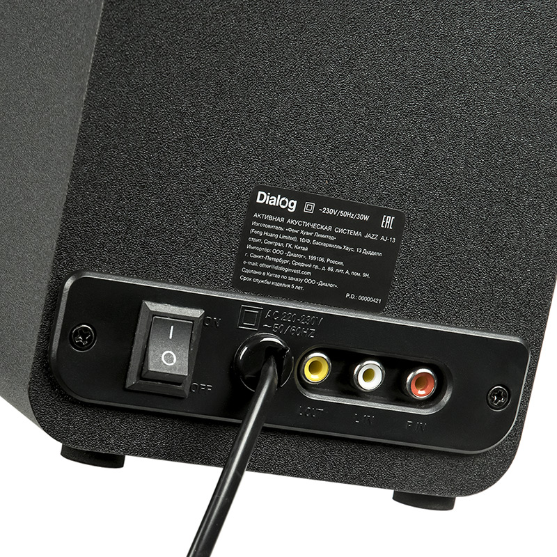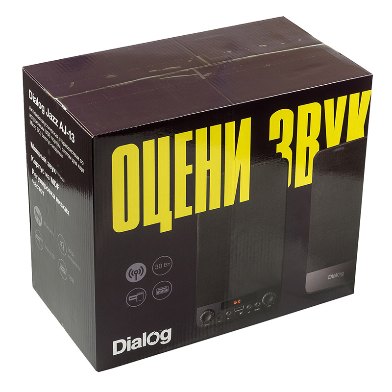| Model | AJ-13 Black | | Type | Tabletop / Bookshelf | | Mode | Stereo | | Power RMS, W | 30 | | Wireless interface | Yes. Bluetooth v5.0 | | Yes | | Supported media | Yes, MicroSD (TransFlash) | | No | | Supported file system type and size | FAT16/FAT32, up to 32Gb | | Supported file formats | MPEG-1 Audio Layer 3 (MP3), with 64 - 320 kbps bitrate. FLAC, WAV, WMA | | Components | Active speakers | | Amplifier | Built-in | | SNR | > 85 | | Power suppply | Built-in | | Karaoke | No | | Controls | on the front panel of the active speaker: Bass control, volume control, previous track, next track, play / pause, mode selection; On/Off switch on the rear panel | | Remote control | No | | Indication | LED symbolic display, red characters | | Color music | No | | interconnection cable | Cable fixed in passive speaker, connected to active speaker via RCA-M connector, length 120 cm. ± 5% | | Power cable length (m) | 130 cm. ± 5% | | Loud speaker(s) | 2*3,5″ | | Power (W) | 30 | | Impedance (Ohm) | 4Ω | | Frequency range (Hz-kHz) | 90-20 | | Phase inverter | pipe on the back panel, D = 22mm, L = 100mm | | Case | MDF | | Grill | Non-removable black textile grill | | Case dimensions (H*L*D, mm) | 220*124*132 | | Weight (Kg) | Active right speaker 1.32, passive left speaker 0.96 (weight without cables). Total weight with power cords and interconnect cable 2.35 | | Supplied parts | 2 speakers, 3.5mm TRS minijack - 2*RCA-M cable, warranty card, packaging |