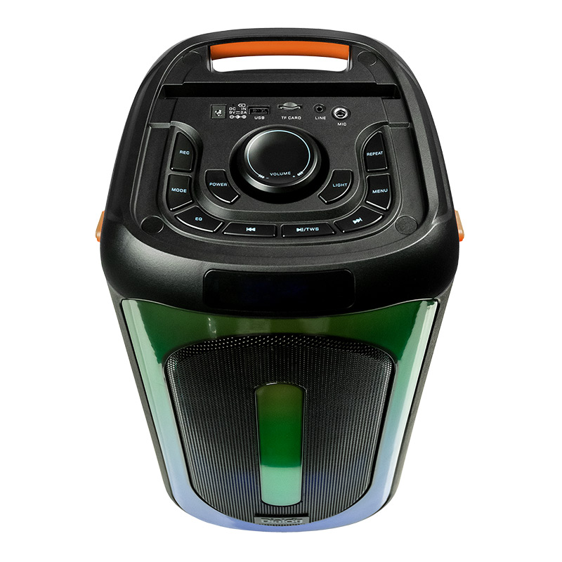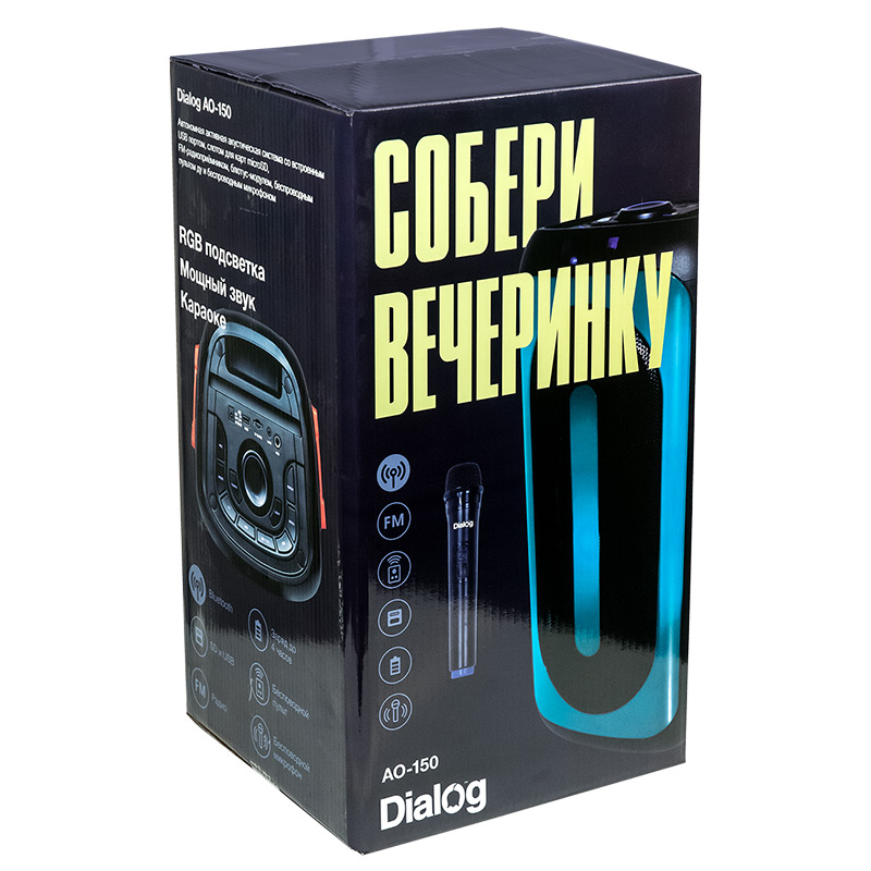 | Model | AO-150 | | Type | Floorstanding portable | | Mode | Mono | | Power RMS, W | 40 | | Wireless interface | Yes. Bluetooth v.5.0 BDR+EDR, GFSK, π/4-DQPSK, 8-DPSK | | TWS mode supported | Yes. You can build a stereo pair of two identical speakers | | Battery | Built-in, 3600 mAh, 7.4V | | Powerbank mode | No | | Headset mode | No | | Yes | | Supported media | Yes, MicroSD (TransFlash) | | Yes, internal antenna | | Supported file system type and size | FAT16/FAT32, up to 32Gb | | Supported file formats | MPEG-1 Audio Layer 3 (MP3), with 64 - 320 kbps bitrate | | Components | outdoor speaker system | | Amplifier | Built-in | | SNR | 92 | | Harmonic distortion | <3% | | Power suppply | Built-in battery OR power from external AC power adapter (9V, 2A, included) | | Inputs | Line in AUX (3.5mm minijack) | | Karaoke | Yes. microphone input (6,3mm jack) and it is possible to record to a USB flash drive; Wireless microphone included, the wireless microphone is powered by two AA batteries (LR6, 1.5V) | | Controls | on the top panel: power, next recording/radio station, previous recording/radio station, playback/pause/TWS, mode selection (sound source), menu, total volume, microphone recording, color music, repeat playback, equalizer | | Remote control | Yes. IR remote control, 33 buttons, powered by two AAA batteries | | Indication | 4-character display at the top of the front panel of the speaker, the volume level is displayed by the backlight on the front panel: during the volume change, the illumination changes, the higher the volume, the larger the area of the panel is highlighted | | Color music | Yes, switchable RGB color music/dynamic backlight on the front panel | | Loud speaker(s) | 2*6,5″ + 2″ | | Power (W) | 40 | | Impedance (Ohm) | 4 | | Frequency range (Hz-kHz) | 45-20 | | Case | Plastic | | Grill | Black metallic | | Case dimensions (H*L*D, mm) | 490*230*245 | | Weight (Kg) | 4.35 | | Supplied parts | speaker system - 1 pc, wireless microphone - 1 pc, IR remote control - 1 pc, AAA batteries for remote control - 2 pcs, AA batteries for wireless microphone - 2 pcs, 9V 2A power adapter - 1 pc, user manual with warranty card - 1 pc, package - 1 pc |
