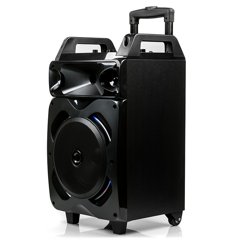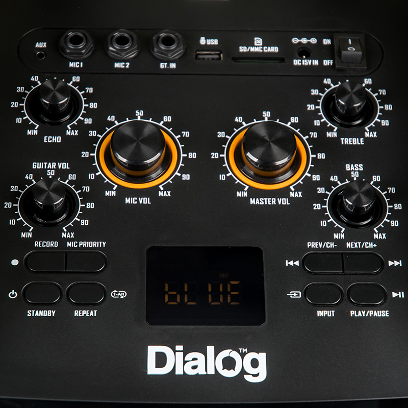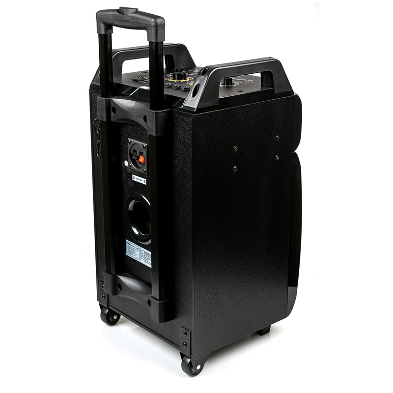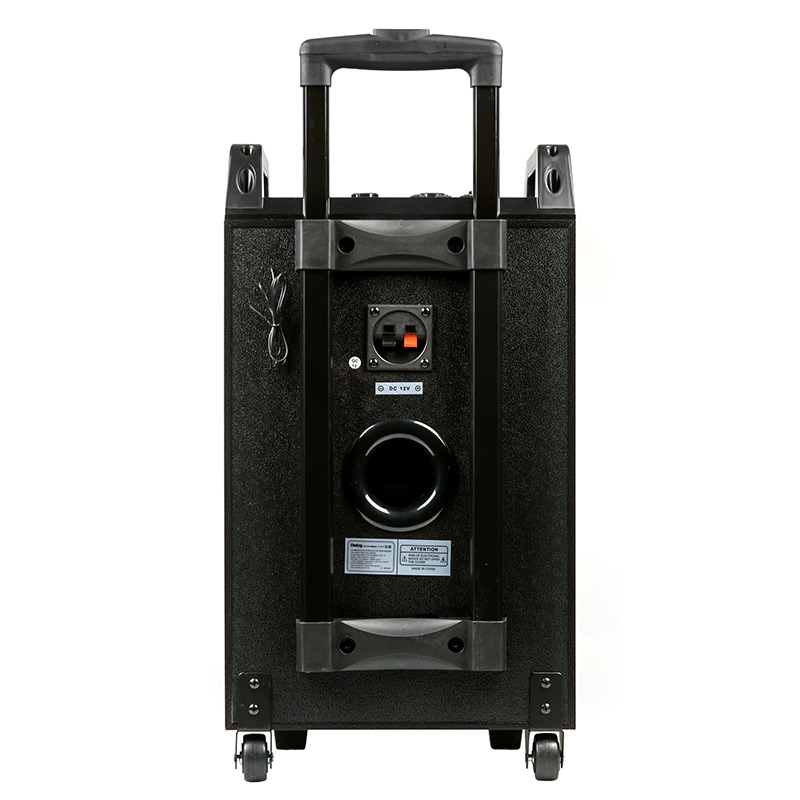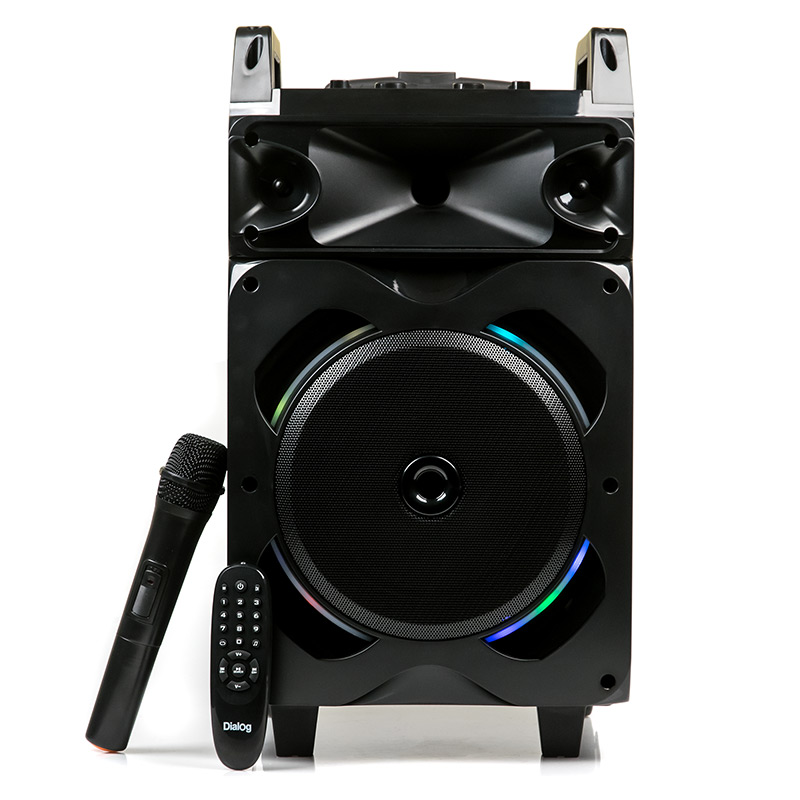 | Model | AO-210 | | Type | Floorstanding portable | | Mode | Mono | | Power RMS, W | 70 | | Wireless interface | Yes. Bluetooth | | TWS mode supported | No | | Battery | Built-in, 4500 mAh *The speakers should be stored and used strictly in an upright position to avoid battery leakage! | | Yes | | Supported media | Yes, SD/MicroSD (TransFlash) via adapter | | Yes. External flexible antenna | | Supported file system type and size | FAT16/FAT32, up to 32Gb | | Supported file formats | MPEG-1 Audio Layer 3 (MP3), with 64 - 320 kbps bitrate. FLAC, WAV, WMA | | Components | outdoor speaker system | | Amplifier | Built-in | | Power suppply | Built-in battery OR power from external AC power adapter (15V, 2A) OR power from external 12V battery | | Inputs | Line in AUX (3.5mm minijack) | | Karaoke | Yes, 2* microphone input (6.3mm jack), volume controls and reverb (echo). Wireless microphone supported and included | | Controls | on the top panel: power on / off, next recording / radio station, previous recording / radio station, play / pause, mode selection (sound source), microphone priority, start/stop microphone recording, standby, repeat; controls: volume, microphone volume, microphone echo, low frequency (Bass), high frequency (Treble), guitar volume | | Remote control | Yes. IR remote, 20 buttons; dimensions,mm 150*45*20, powered by 2xAAA batteries | | Indication | four-character display on the top side (glowing yellow characters, dark display) | | Color music | Yes, multicolor color music | | Loud speaker(s) | 8″ + 1″ | | Power (W) | 70 | | Phase inverter | pipe at the rear panel, D = 55mm, L = 110mm | | Case | MDF, 6 mm | | Grill | Black metallic | | Case dimensions (H*L*D, mm) | Body: 455*300*270, legs/wheels: 45mm, carrying handles 50mm, retractable handle raises up to 29 cm. | | Supplied parts | outdoor speaker system - 1 pc, power supply 220V AC - 15V 2A DC - 1 pc, karaoke wireless microphone - 1 pc, IR remote control -1 pc, user manual with warranty card - 1 pc, package - 1 set |