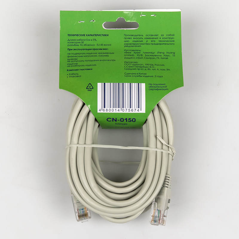 | Модель | CN-0150 Beige | | Тип кабеля | Патч-корд UTP Cat5e RJ-45 | | Версия | UTP Cat5e | | Коннектор 1 | 8P8C (RJ-45), вилка | | Коннектор 2 | 8P8C (RJ-45), вилка | | Длина, м | 5,0 | | Вес, г. | 104 | | Применимость | Кабель предназначен для передачи данных по локальной сети между компьютерами, маршрутизаторами, медиа плеерами, телевизорами и прочими устройствами с коннекторами RJ-45 | | Код ТНВЭД | 8544421000 |