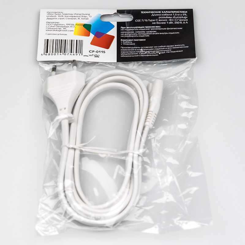 | Модель | CP-0115 White | | Тип кабеля | Электрический кабель Евровилка - Евроразъем 1,5м. | | Коннектор 1 | CEE 7/16 Type C (Евровилка) | | Коннектор 2 | IEC C7 (Евроразъем), неполяризованный | | Длина, м | 1,5 | | Применимость | Кабель предназначен для подключения аудио- и видеоаппаратуры, блоков питания ноутбуков и игровых консолей и других приборов с двойной изоляцией к электрическим розеткам. Не более 1 кВт, 250 В, 6А | | Код ТНВЭД | 8544429009 |