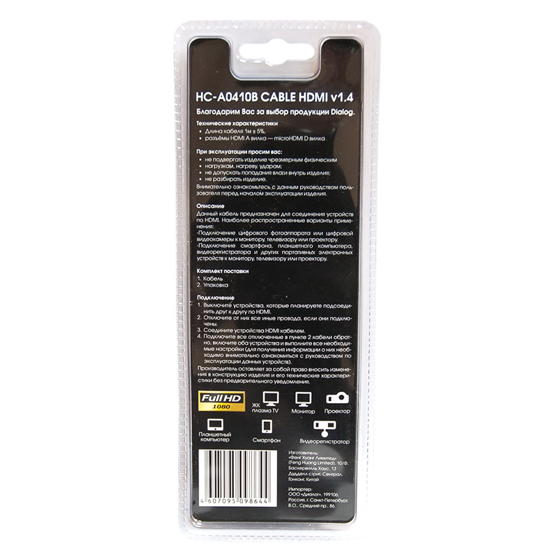 | Модель | HC-A0410B | | Тип кабеля | Кабель HDMI A - Micro HDMI D (m-m) | | Версия | HDMI 1.4b | | Коннектор 1 | HDMI тип А, вилка | | Коннектор 2 | Micro HDMI тип D, вилка | | Длина, м | 1,0 | | Применимость | Кабель предназначен для соединения устройств с интерфейсом HDMI, например LED/LCD TV, плазменные TV, компьютерные мониторы, проекторы, игровые консоли, компьютеры, ноутбуки, планшеты, смартфоны, видеорегистраторы и т.д. | | Код ТНВЭД | 8544429007 |