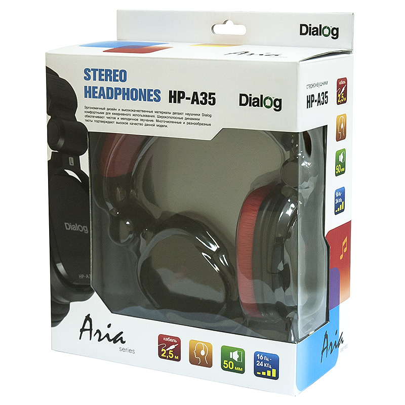 Наушники Dialog Aria HP-A35 имеют ряд особенностей, обуславливающих их высокие потребительские качества: в основе наушников - 50-миллиметровые 64-Омные динамики с высокой чувствительностью (92 дБ/мВт), что позволяет очень достоверно воспроизводить весь диапазон частот. Чашки этих наушников имеют четыре степени свободы, благодаря чему они будут идеально сидеть на любой голове, чашки поворачиваются вбок на 90 градусов. Это также позволяет компактно складывать наушники для переноски. Закрытое акустическое оформление в совокупности с плотно облегающими голову амбушюрами прекрасно изолирует слушателя от внешних звуков, при этом ушная раковина находится внутри амбушюров и давление приходится на голову вокруг ушей, а это значительно увеличивает срок комфортного ношения наушников. Оголовье и амбушюры сделаны из мягкого синтетического материала, который легко очищается от загрязнений. Витой мягкий шнур длиной 2,5 метра очень компактен и при этом в случае необходимости способен растягиваться на полную длину. Идущий в комплекте с наушниками позолоченный переходник 3,5мм - 6,35мм джек (1/4" TRS) с резьбовым соединением позволит подключить наушники к профессиональной аппаратуре. Вес наушников вместе с кабелем составляет всего 330 г., без кабеля - 284 г. В целом звучание этой модели можно охарактеризовать как ровное, без существенных неравномерностей АЧХ, что позволяет использовать их как мониторные наушники.
