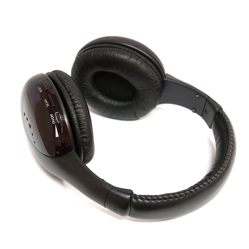 УправлениеНа правом наушнике: колёсико включения питания и регулировки громкости, кнопка "Scan" для настройки связи с передатчиком, кнопка "Reset" для сброса настройки связи с передатчиком. На передатчике: переключатель питания и режима работы
