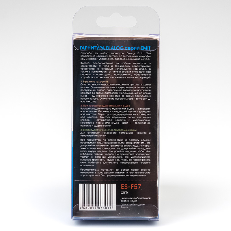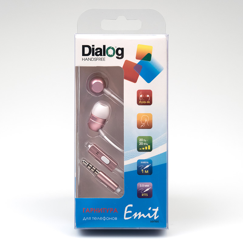 Гарнитура Dialog ES-F57 Pink| Описание модели | Гарнитура Dialog ES-F57 предназначена для использования со смартфонами, сотовыми телефонами, планшетными и стационарными компьютерами, mp3 плеерами и иными устройствами, оснащёнными входом для наушников 3.5мм. | | Технические характеристики | Модель перенесена в архив 24.03.2023 | | Модель: | ES-F57 Pink | | Управление | многофункциональная кнопка управления, совмещенная с блоком микрофона | | Режим | стерео | | Размер динамика (мм) | 9 | | Частотный диапазон (Гц - кГц) | 20-20 | | Акустическое оформление | вкладыши, канальные | | Чашки | алюминиевые | | Амбушюры | силикон, белый | | Кабель | Тонкий белый кабель. Длина: Миниджек: 3,5см, кабель миниджек-разветвитель: 83 см, разветвитель: 1,5 см, кабель разветвитель-микрофон: 18 см, микрофон: 2,5см, кабель микрофон-наушник: 20 см, наушник: 1,5 см. Полная длина 130 см. Длина кабеля от разветвителя до наушника: 40см, одинаковая для левого и правого наушника. | | Тип разъема | 3.5 мм TRRS четырехконтактный стереоджек, прямой алюминиевый корпус розового цвета | | Вес наушников с кабелем (г.) | 13 | | Микрофон |