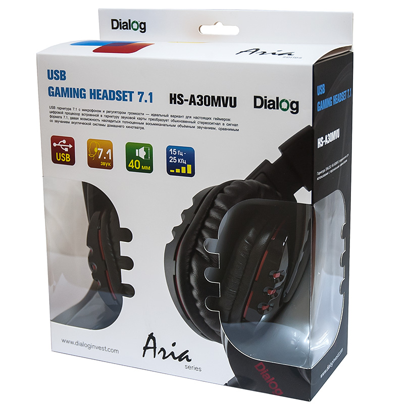 Гарнитура с регулятором громкости Dialog HS-A30MVU BLACK| Описание модели | Dialog Aria HS-A30MVU - это гарнитура с интерфейсом USB на базе чипа C-Media, предназначена для использования с персональными компьютерами под управлением ОС Windows (XP или более современной). Главная особенность этой гарнитуры в процессоре обработки звука C-Media Xear, который преобразует обычный стереосигнал в сигнал формата 7.1, что позволяет создать многоканальный объемный звук в играх. В основе наушников - 40-миллиметровые 32-Омные динамики с неодимовым магнитом. Чашки наушников этой гарнитуры жестко закреплены на оголовье, регулируются по высоте до 38 мм. Закрытое акустическое оформление в совокупности с плотно облегающими голову амбушюрами отлично изолирует слушателя от внешних звуков, ушная раковина находится внутри амбушюров и давление приходится на голову вокруг ушей, что значительно увеличивает срок комфортного ношения наушников. Оголовье и амбушюры изготовлены из искусственной кожи, легко очищаются от загрязнений. Гарнитура имеет цифровой регулятор громкости с индикатором работы и кнопками отключения микрофона и наушников. Гарнитура может работать под управлением стандартного драйвера Windows, но расширенные настройки доступны после установки оригинального драйвера, поставляемого вместе с гарнитурой. | | Технические характеристики | Модель перенесена в архив 12.01.2018 | | Модель: | HS-A30MVU BLACK | | Индикация | Индикатор включения на регуляторе громкости (на шнуре) | | Управление | Цифровой регулятор громкости, кнопки включения/выключения микрофона и динамиков (на шнуре) | | Режим | 7.1 | | Размер динамика (мм) | 40, неодимовый магнит | | Сопротивление (Ом) | 32 | | Чувствительность (дБ/мВт) | 100 ± 3 @ 1 КГц | | Частотный диапазон (Гц - кГц) | 15-25 | | Акустическое оформление | закрытое | | Чашки | пластик | | Кабель | 2,9 ± 10% | | Тип разъема | USB | | Вес наушников с кабелем (г.) | 304 | | Вес наушников без кабеля (г.) | 220 | | Микрофон |