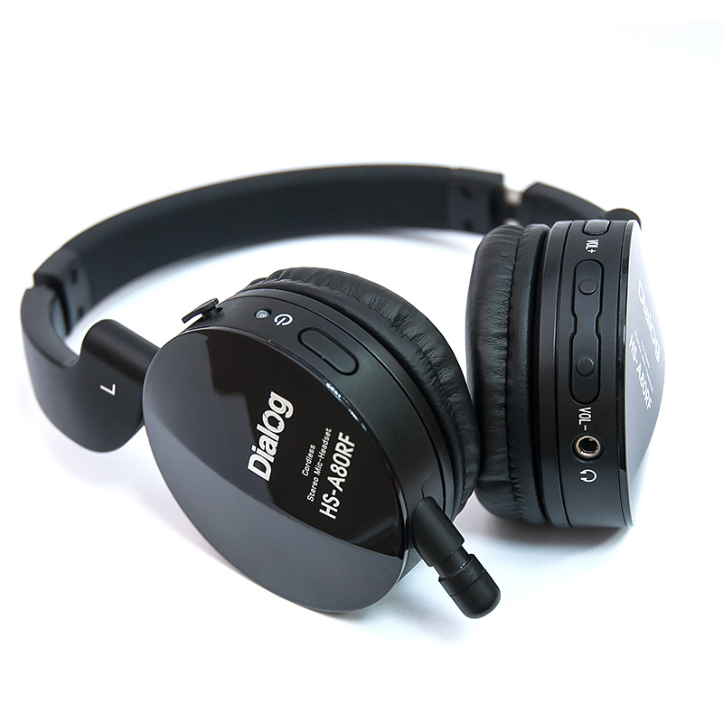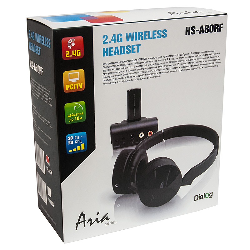 Беспроводная гарнитура 2.4 gHz с регулятором громкости Dialog HS-A80RF BLACK| Описание модели | Dialog Aria HS-A80RF - беспроводная стереогарнитура, работающая на частоте 2.4 ГГц. Уверенный прием сигнала гарантирован на расстоянии до 10 метров от места подключения USB-передатчика. Батарея повышенной емкости и энергосберегающие технологии обеспечивают до десяти часов работы гарнитуры без подзарядки. Коммутационный блок позволяет подключить устройство практически к любому источнику сигнала через гнёзда линейного выхода, а USB интерфейс передатчика обеспечит лёгкое подключение гарнитуры к ПК с современной операционной системой. Гарнитуру можно использовать с ПК, аудио- и видеопроигрывателями, телевизорами и т.д. Для удобства длительного ношения вес гарнитуры минимален - всего 182 г. На левой чашке расположены: микрофон, для включения которого достаточно вытянуть его наружу на 5мм; кнопка и индикатор включения; гнездо для З/У 5В с заглушкой. На правой чаше: кнопка установления связи с передатчиком; двойная кнопка-качелька регулятора громкости; выход стереоджек 3,5 мм. Оголовье выполнено из мягкого прорезиненного материала с гибким металлическим каркасом, амбушюры небольшого размера, плотно прилегающие к ушным раковинам. Гарнитура надёжно держится на голове, не пытается соскользнуть, совершенно не стесняет пользователя в движениях. При этом данная модель отлично звучит, как и все остальные модели линейки Dialog Aria. | | Технические характеристики | Модель перенесена в архив 30.01.2015 | | Модель: | HS-A80RF BLACK | | Интерфейс/спецификация | Несущая частота 2.4 ГГц, всенаправленная антенна, мощность передатчика 4дБм | | Радиус уверенного приёма, м | 10 | | Индикация | Индикатор включения на левом наушнике | | Управление | На левом наушнике: регулятор громкости, кнопка установления связи, кнопка включения гарнитуры | | Режим | стерео | | Размер динамика (мм) | 40 | | Сопротивление (Ом) | 28 | | Чувствительность (дБ/мВт) | 100 ± 3 @ 1 КГц | | Частотный диапазон (Гц - кГц) | 20-20 | | Акустическое оформление | закрытое | | Чашки | пластик | | Тип разъема | USB, 3.5 мм TRS стереоджек | | Вес наушников без кабеля (г.) | 182 | | Микрофон |