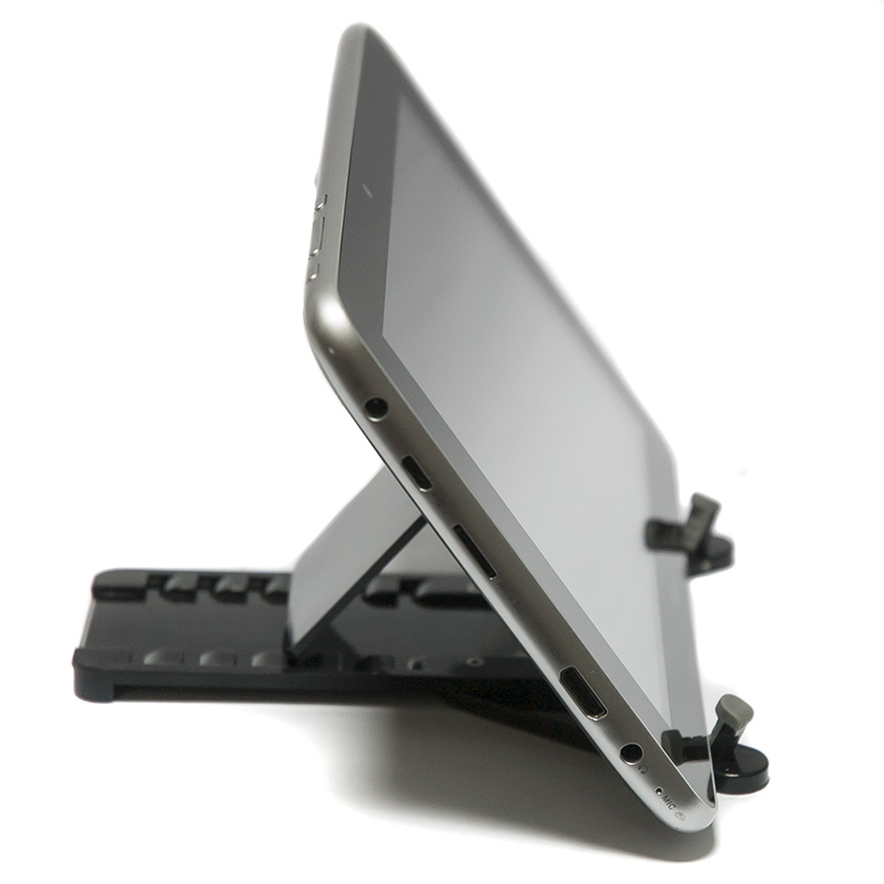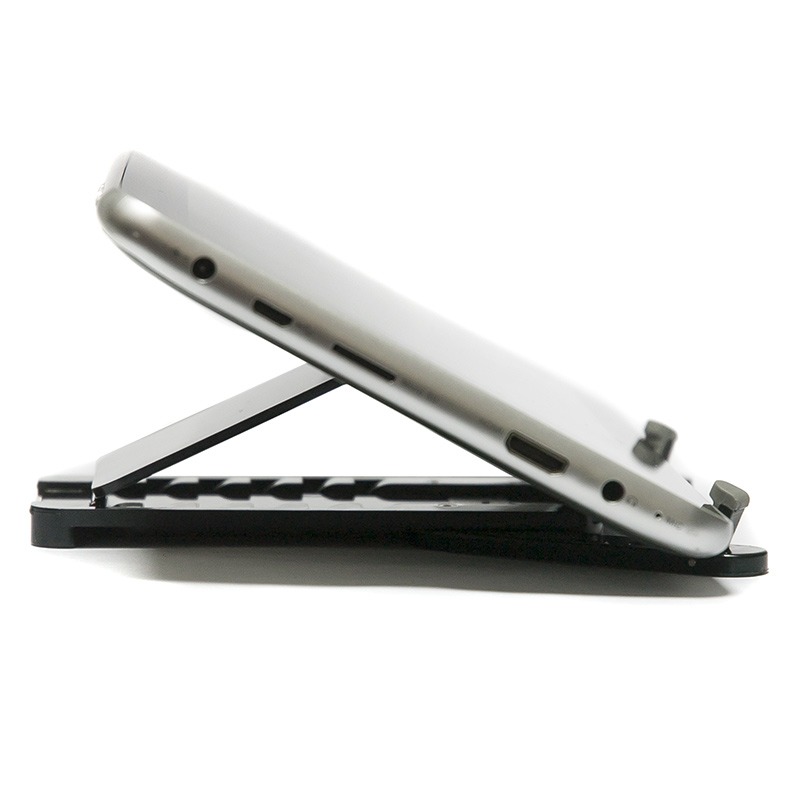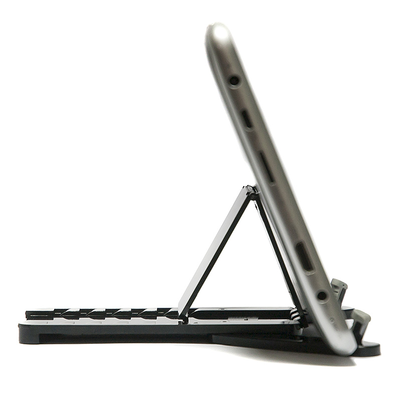 Это компактное, легкое, изящное устройство, позволяющее устанавливать мобильные устройства на горизонтальные поверхности так, чтобы обеспечить их комфортное использование сидящему человеку. Подготовьте держатель в несколько движений, установите в него планшет или смартфон и вот уже ваш электронный помощник нажёжно размещён на столе с развёрнутым под оптимальным углом экраном. Держатель очень легок и компактен, он без труда помещается как в сумочке, так и в кармане. Держатель подойдёт как для самых миниатюрных телефонов, так и для десятидюймовых планшетов. Специальные резиновые вставки на нижней поверхности устройства препятствуют скольжению держателя по столу. |