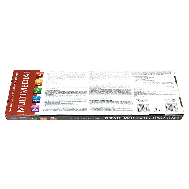 | Модель | KM-015U Black | | Интерфейс | USB | | Корпус | черный матовый пластик | | Количество клавиш | 114 (104 основные + 10 мультимедийных) | | Клавиши Windows | да | | Мультимедиа-клавиши | да, два блока: левый - 5 клавиш (почта, домой, мой компьютер, калькулятор, отключение звука), правый - 5 клавиш (воспроизведение/пауза, перемотка назад, перемотка вперед, громкость выше, громкость ниже) | | Регулируемый угол наклона | да | | Длина кабеля, м | 1,5 | | Габаритные размеры (В*Ш*Г, мм) | 455*145*22 | | Вес (кг) | 0,460 | | Комплект поставки | клавиатура, гарантийный талон, упаковка | | Код ТНВЭД | 8471606000 | | Гарантийный срок, мес. | 6 | | Cрок службы, мес. | 24 |