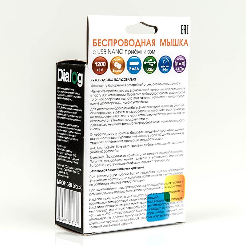 | Модель | MROP-06U Black | | Интерфейс | USB | | Тип | Оптическая (видимый диапазон) | | Разрешение, CPI | 1200 | | Динамически изменяемое разрешение | Нет | | Материал корпуса | пластик | | Количество кнопок | 3 | | Прокрутка | вертикальная | | Беспроводная | радиоинтерфейс 2.4 гГц, радиус действия до 10 метров | | Съемные/встроенные аккумуляторы | батарейки | | Тип элементов питания | AAA | | Кол-во элементов питания | 2 | | Размеры (В*Ш*Г, мм), max | 97*60*34 | | Вес нетто, г. (без кабеля/батареек/грузиков и т.п.) | 47 | | Комплект поставки | мышь, USB nano приёмник, гарантийный талон, батарейка ААА (не перезаряжаемая) - 2 шт, упаковка (картонная коробка) | | Код ТНВЭД | 8471607000 | | Гарантийный срок, мес. | 6 | | Cрок службы, мес. | 24 |