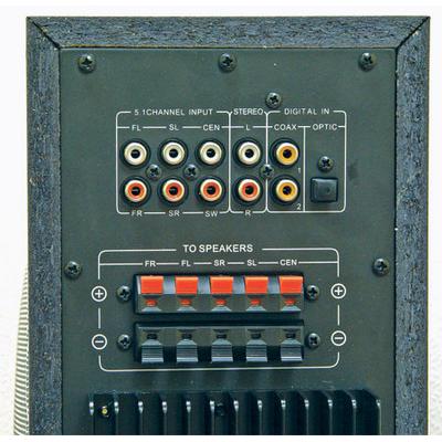 Активная шестикомпонентная акустическая система 5.1 со встроенным декодером для домашнего кинотеатра Dialog Jazz J-D104BT| Технические характеристики | | Модель | DIALOG J-D104BT | | Мощность RMS (Вт) | 179 | | 5.1 | да | | Компоненты | сабвуфер, 2 фронтальных сателлита, 2 тыловых сателлита, центральный сателлит | | Усилитель | встроенный | | Соотношение сигнал/шум (дБ) | >75 | | Разделение (дБ) | >45 | | Декодер | Dolby Digital | | Блок питания | встроенный | | Входы | два коаксиальных входа, оптический вход, вход 5.1 (6RCA), стереовход (2RCA) | | Управление | питание, громкость, выбор источника сигнала | | Пульт ДУ | полнофункциональный, инфракрасный | | Индикация | светодиод (питание), люминисцентный дисплей | | Длина сетевого кабеля (м) | 1,5 | | Сабвуфер | | | Динамик(и) | 6.5″ (на боковой стенке) | | Мощность (Вт) | 60 | | Сопротивление (Ом) | 6 | | Частотный диапазон (Гц-Гц) | 20-250 | | Материал динамика(ов) | текстурированная бумага | | Фазоинвертор | на передней панели, труба, D=65 мм, L=100 мм | | Магнитное экранирование | да | | Корпус | MDF, 12 мм | | Гриль | металлический, серебристый цвет | | Габаритные размеры (В*Ш*Г, мм) | 450*150*400 | | Фронтальные сателлиты | | | Динамик(и) | ВЧ - 1″, НЧ - 3″ | | Мощность (Вт) | ВЧ - 3, НЧ - 20 | | Сопротивление (Ом) | ВЧ - 4, НЧ - 4 | | Частотный диапазон (Гц-КГц) | 250-20 | | Материал динамика(ов) | ВЧ - фольга, НЧ - бумага | | Фазоинвертор | на задней панели, труба, D=22, L=40 | | Магнитное экранирование | да | | Корпус | MDF, 4 мм | | Гриль | ткань, серебристый цвет | | Габаритные размеры (В*Ш*Г, мм) | 475*95*110 (с подиумами - 515*125*145) | | Подиумы | да | | Тыловые сателлиты | | | Динамик(и) | ВЧ - 1″, НЧ - 3″ | | Мощность (Вт) | ВЧ - 3, НЧ - 20 | | Сопротивление (Ом) | ВЧ - 4, НЧ - 4 | | Частотный диапазон (Гц-КГц) | 250-20 | | Материал динамика(ов) | ВЧ - фольга, НЧ - бумага | | Фазоинвертор | на передней панели, труба, D=15 | | Магнитное экранирование | да | | Корпус | MDF, 4 мм | | Гриль | ткань, серебристый цвет | | Габаритные размеры (В*Ш*Г, мм) | 200*95*110 | | Крепления на стену | да (проушины) | | Центральный сателлит | | | Динамик(и) | ВЧ - 1″, НЧ - 2*3″ | | Мощность (Вт) | ВЧ - 3, НЧ - 2*20 | | Сопротивление (Ом) | ВЧ - 4, НЧ - 4 | | Частотный диапазон (Гц-КГц) | 250-20 | | Материал динамика(ов) | ВЧ - фольга, НЧ - бумага | | Фазоинвертор | на задней панели, труба, D=22, L=40 | | Магнитное экранирование | да | | Корпус | MDF, 4 мм | | Гриль | ткань, серебристый цвет | | Габаритные размеры (В*Ш*Г, мм) | 95*280*110 | | Комплект поставки | сабвуфер, 2 фронтальных сателлита, 2 тыловых сателлита, центральный сателлит, подиумы для фронтальных сателлит - 2 шт., комплект крепежа для подиумов, провода для подключения сателлитов (короткие) - 3 шт., провода для подключения сателлитов (длинные) - 2 шт., кабель 6RCA->6RCA - 1 шт., кабель 6RCA->3 стереоджек 3.5 мм - 1 шт., коаксиальный кабель, пульт ДУ, батарейки - 2 шт., упаковка, руководство пользователя | | Гарантийный срок, мес. | 12 | | Cрок службы, мес. | 60 |
