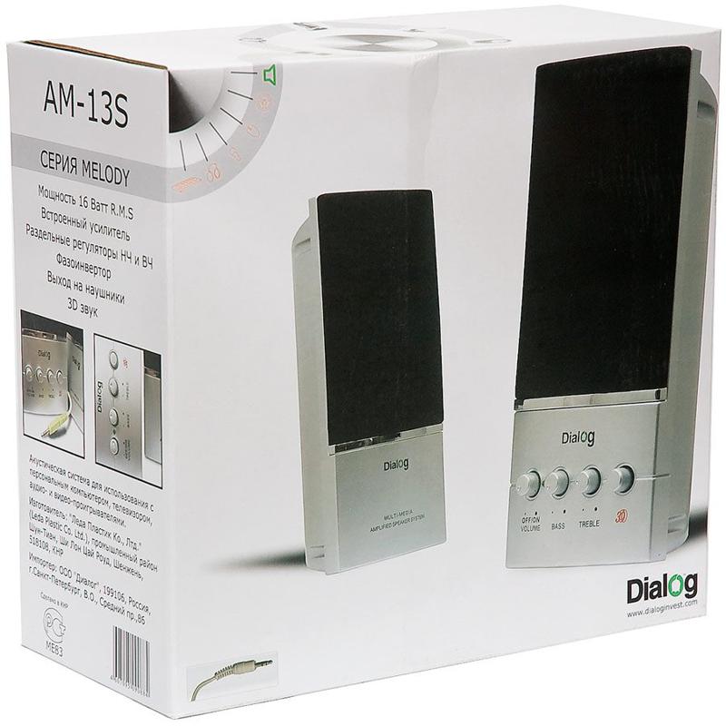 Активная акустическая система Dialog Melody AM-13S| Описание модели | DIALOG AM-11S, AM-11B, AM-11W, AM-12S, AM-12B, AM-12W, AM-13S, AM-13B, AM-13W - активные акустические системы начального уровня. Корпуса из высококачественного пластика заметно снижают себестоимость систем по сравнению с моделями, имеющими деревянные корпуса. Акустика такого класса лучше всего подходит для пользователей, не имеющих определенных пристрастий в музыке и желающих получить просто пару хороших колонок для использования со своим настольным ПК.