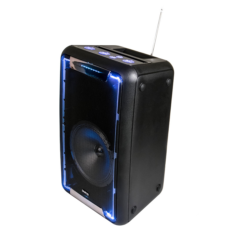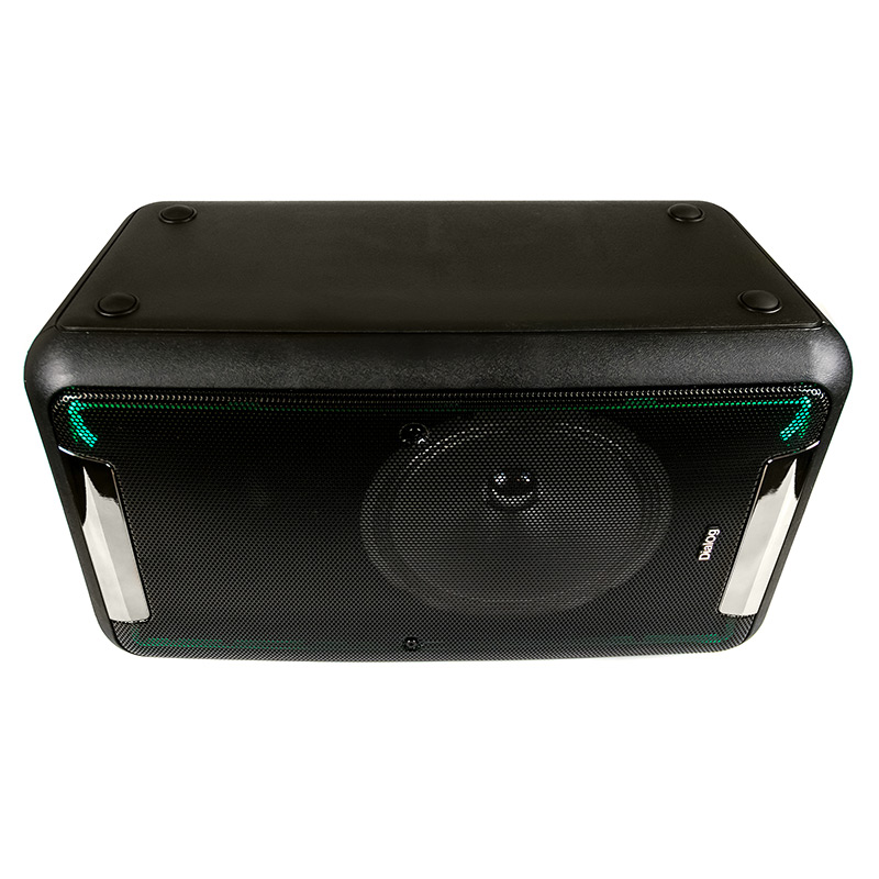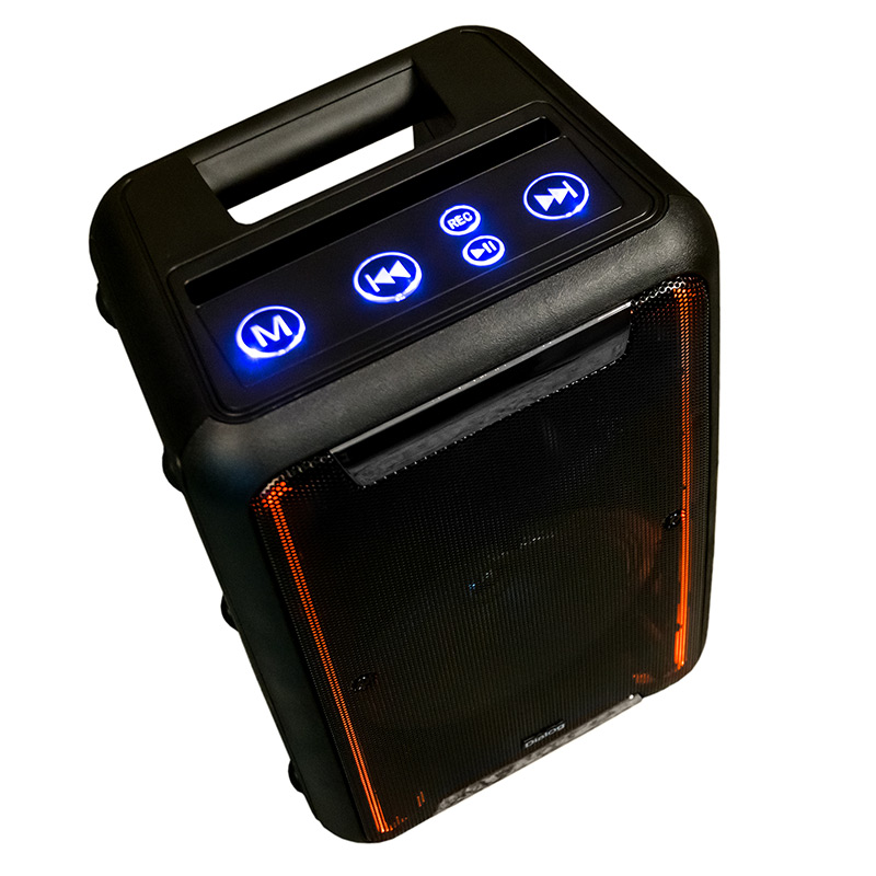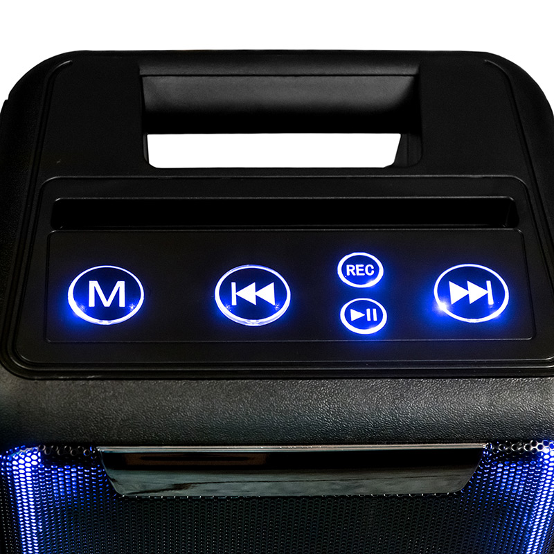 Управлениепитание вкл/выкл, кнопки на верхней панели (крупные кнопки с голубой подсветкой): следующая запись/радиостанция, предыдущая запись/радиостанция, воспроизведение/пауза, выбор режима (источника звука), запись звука с микрофона; кнопки на задней панели: полностью продублированы. Регуляторы на задней панели: общая громкость, уровень ВЧ, громкость микрофонов, эффект эхо для микрофонов.