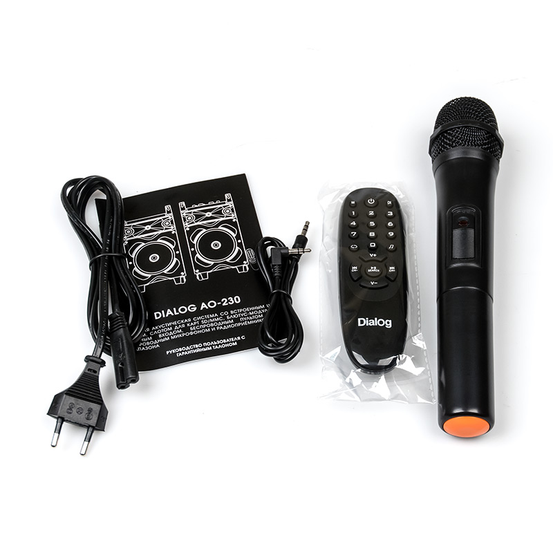 Комплект поставкиактивная колонка - 1шт, пассивная колонка - 1 шт, кабель питания ~220В - 1 шт, беспроводной караоке микрофон - 1 шт, ИК пульт ДУ - 1 шт, кабель AUX minijack 3.5mm прямой -> minijack 3.5mm угловой - 1 шт, руководство пользователя с гарантийным талоном - 1 шт, упаковка