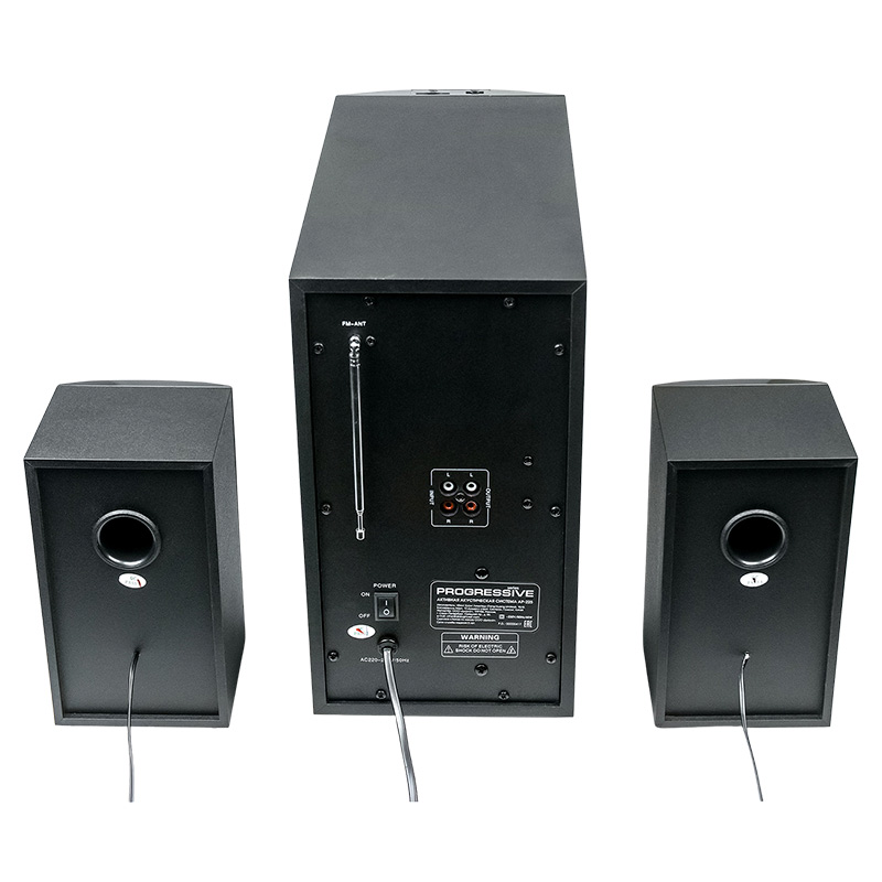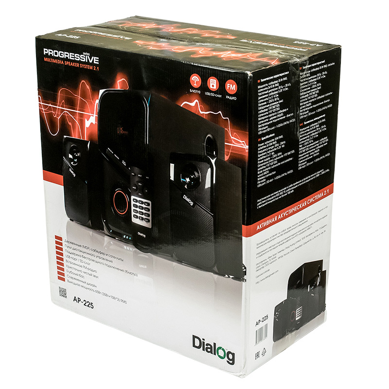 Активная акустическая система 2.1 Dialog Progressive AP-225| Технические характеристики | Модель перенесена в архив 14.09.2022 | | Модель | AP-225 | | Мощность RMS (Вт) | 65 | | Поддержка Bluetooth | Да | | USB вход | Да | | Поддержка карт SD (Secure Digital) | Да. SD, а также miniSD и microSD (через переходник, приобретаемый отдельно) | | FM радио | Да, память на 100 радиостанций | | Усилитель | встроенный | | Компоненты | сабвуфер, два сателлита | | Соотношение сигнал/шум | >80 | | Гармонические искажения | не более 0.3% при мощности 1 Вт и полосе 1 кГц | | Блок питания | встроенный | | Входы | стереовход (2RCA) на задней стенке; USB порт для флэш-накопителей; Слот для SD карт в верхней части фронтальной панели | | Управление | сабвуфер: питание, переключение источника сигнала, пауза/воспроизведение, вперед/назад (по трекам или радиостанциям), регулятор громкости с красной подсветкой; пульт ДУ: подробное описание в руководстве пользователя | | Пульт ДУ | инфракрасный пульт ДУ. Питание от двух батареек ААА (LR03) | | Индикация | четырехсимвольный дисплей на сабвуфере с индикацией режима работы и эквалайзером, красные символы | | Длина сетевого кабеля (м) | 1,5 | | Сабвуфер | | | Динамик(и) | 5.25″ | | Мощность (Вт) | 35 | | Сопротивление (Ом) | 4 | | Частотный диапазон (Гц-Гц) | от 20 Гц | | Материал диффузора | бумага | | Фазоинвертор | труба на боковой стенке, D=50 мм, L=100 мм | | Магнитное экранирование | да | | Корпус | MDF, 9 мм | | Габаритные размеры (В*Ш*Г, мм) | 360*310*170 (корпус без учета ножек). Ножки 15мм | | Вес (кг) | 4,80 | | Сателлиты | | | Динамик(и) | 3″ | | Мощность (Вт) | 15 | | Сопротивление (Ом) | 4 | | Частотный диапазон (Гц-КГц) | до 20 кГц | | Материал диффузора | бумага | | Фазоинвертор | на задней стенке, труба D=30мм, L=40мм | | Корпус | MDF, 6 мм | | Гриль | несъемный, черный пластик | | Габаритные размеры (В*Ш*Г, мм) | 200*115*115 | | Вес (кг) | 0,70 | | Комплект поставки | сабвуфер, два сателлита со встроенными кабелями для подключения к сабвуферу, кабель для подключения сабвуфера к источнику сигнала 2RCA->3.5 мм стерео джек, беспроводной пульт ДУ, батарейки ААА для пульта ДУ 2 шт, руководство пользователя/гарантийный талон, упаковка | | Код ТНВЭД | 8527919900 | | Гарантийный срок, мес. | 12 | | Cрок службы, мес. | 60 |