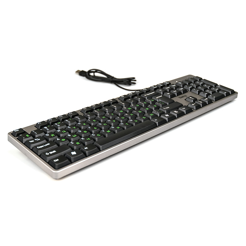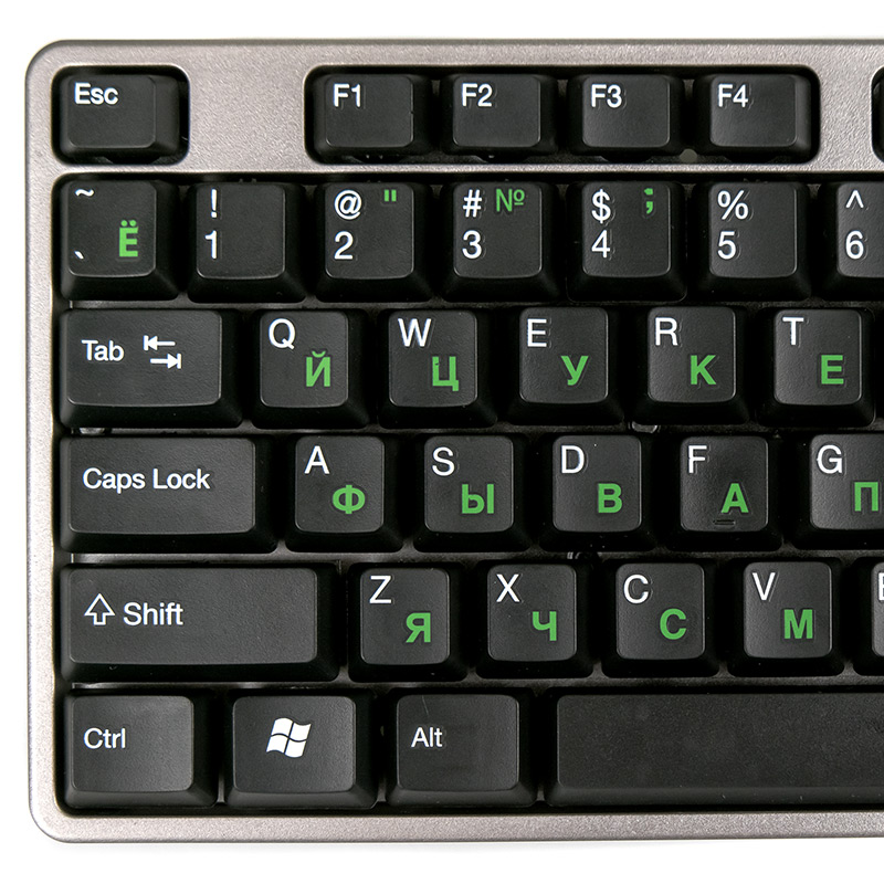 КорпусПластик, серебристый. Латиница - белый цвет, кириллица - зелёный