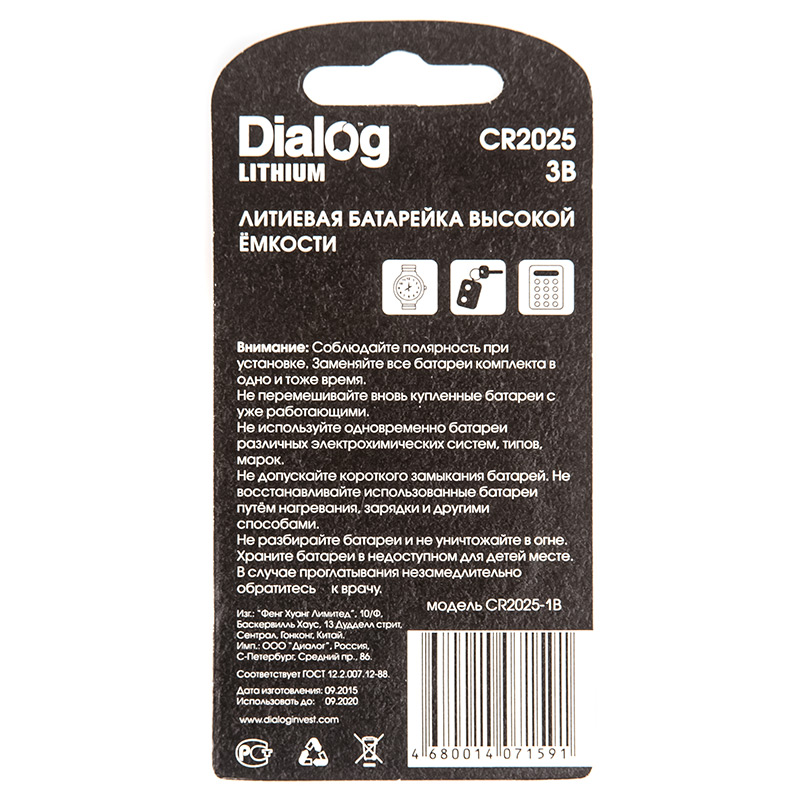 Литиевая батарейка, 1 шт. в блистере Dialog CR2025-1B