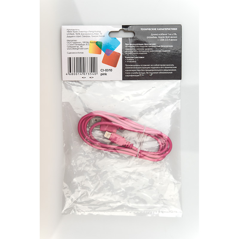 | Модель | CI-0310 Pink | | Тип кабеля | Кабель Apple Lightning 1м. | | Версия | USB 2.0 | | Коннектор 1 | USB тип A, вилка | | Коннектор 2 | Apple Lightning 8-pin | | Длина, м | 1.0 | | Вес, г. | 18 | | Применимость | Кабель предназначен для соединения современных устройств Apple с 8-контактным разъемом Lightning с компьютером, ноутбуком или зарядным устройством. Кабель поддерживает как зарядку, так и передачу данных. Допускается использование устройств Apple с iOS 10.3 или более ранними. Поддержка более поздних версий iOS не гарантируется, но не исключена. | | Код ТНВЭД | 8544429007 |