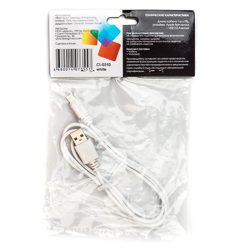 | Модель | CI-0310 White | | Тип кабеля | Кабель Apple Lightning 1м. | | Версия | USB 2.0 | | Коннектор 1 | USB тип A, вилка | | Коннектор 2 | Apple Lightning 8-pin | | Длина, м | 1.0 | | Вес, г. | 18 | | Применимость | Кабель предназначен для соединения современных устройств Apple с 8-контактным разъемом Lightning с компьютером, ноутбуком или зарядным устройством. Кабель поддерживает как зарядку, так и передачу данных. Допускается использование устройств Apple с iOS 10.3 или более ранними. Поддержка более поздних версий iOS не гарантируется, но не исключена. | | Код ТНВЭД | 8544429007 |