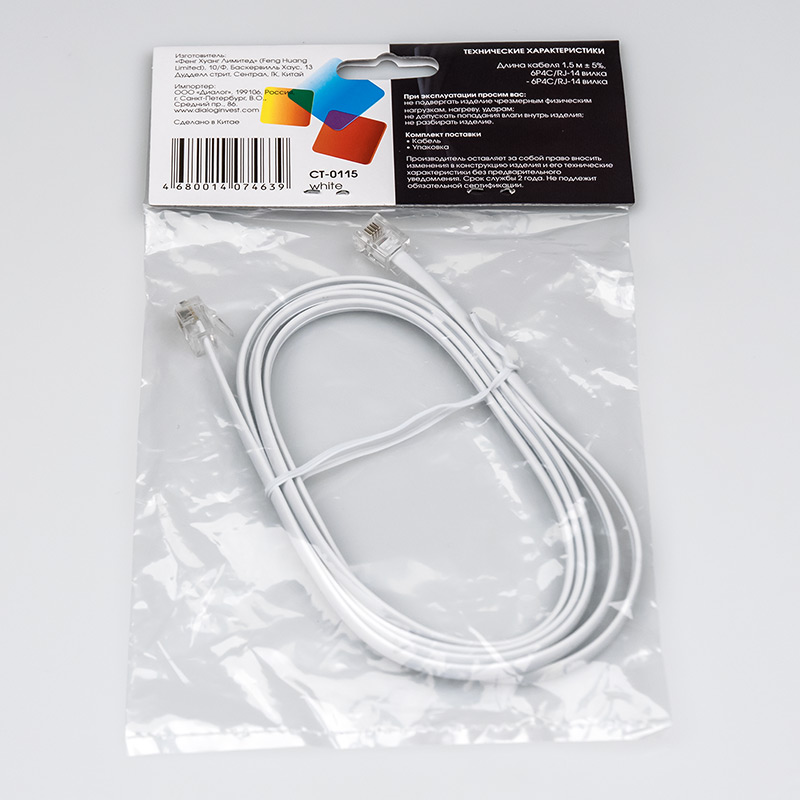 | Модель | CT-0115 White | | Тип кабеля | Телефонный кабель RJ-14 | | Коннектор 1 | 6P4C (RJ-14), вилка | | Коннектор 2 | 6P4C (RJ-14), вилка | | Длина, м | 1,5 | | Применимость | Кабель предназначен для подключения телефонов, факсов, факс-модемов к телефонным розеткам | | Код ТНВЭД | 8544429007 |