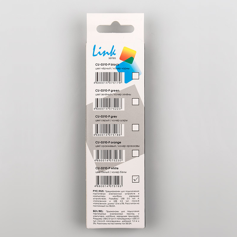 | Модель | CU-0310-P White | | Тип кабеля | Кабель USB A - Micro USB B (m-m) | | Версия | USB 2.0 | | Коннектор 1 | USB тип А, вилка | | Коннектор 2 | Micro USB тип B, вилка | | Длина, м | 1,0 | | Вес, г. | 22 | | Применимость | Кабель предназначен для подключения к компьютеру или ноутбуку устройств с Micro USB 2.0 коннектором, например mp3 плееров, планшетных компьютеров, смартфонов, видеорегистраторов, навигаторов, электронных книг и т.д. | | Код ТНВЭД | 8544429007 |