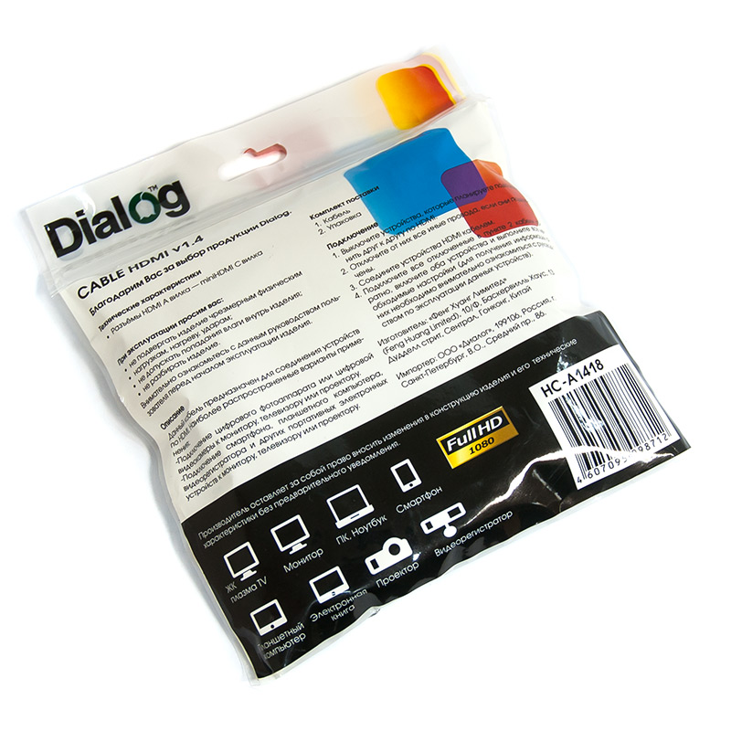| Модель | HC-A1418 | | Тип кабеля | Кабель HDMI A - Mini HDMI C (m-m) | | Версия | HDMI 1.4b | | Коннектор 1 | HDMI тип А, вилка | | Коннектор 2 | Mini HDMI тип C, вилка | | Длина, м | 1,8 | | Применимость | Кабель предназначен для соединения устройств с интерфейсом HDMI, например LED/LCD TV, плазменные TV, компьютерные мониторы, проекторы, игровые консоли, компьютеры, ноутбуки, планшеты, смартфоны, видеорегистраторы и т.д. | | Код ТНВЭД | 8544429007 |