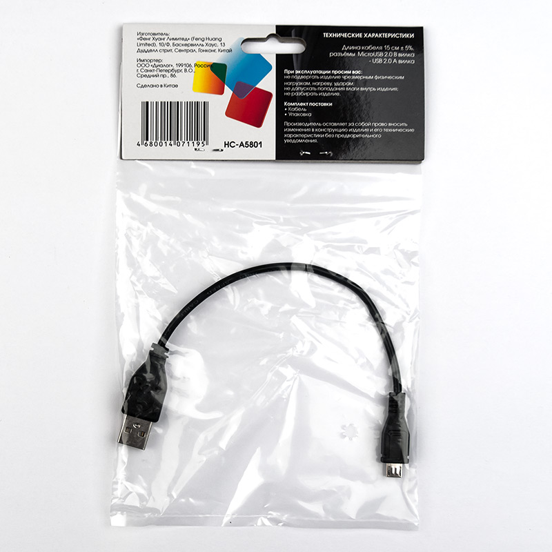 | Модель | HC-A5801 | | Тип кабеля | Кабель USB A - Micro USB B (m-m) | | Версия | USB 2.0 | | Коннектор 1 | USB тип A, вилка | | Коннектор 2 | Micro USB тип B, вилка | | Длина, м | 0,22 | | Вес, г. | 11 | | Применимость | Кабель предназначен для подключения к компьютеру или ноутбуку устройств с Micro USB 2.0 коннектором, например mp3 плееров, планшетных компьютеров, смартфонов, видеорегистраторов, навигаторов, электронных книг и т.д. | | Код ТНВЭД | 8544429007 |
