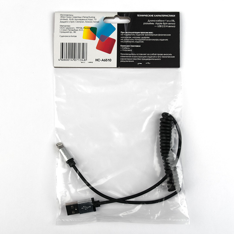 | Модель | HC-A6510 | | Тип кабеля | Кабель Apple Lightning скрученный | | Версия | USB 2.0 | | Коннектор 1 | USB тип A, вилка | | Коннектор 2 | Apple Lightning 8-pin | | Длина, м | 38 см. в скрученном виде, до 90 см в растянутом виде | | Вес, г. | 16 | | Применимость | Кабель предназначен для соединения современных устройств Apple с 8-контактным разъемом Lightning с компьютером, ноутбуком или зарядным устройством. Кабель поддерживает как зарядку, так и передачу данных. Допускается использование устройств Apple с iOS 8.2 или более ранними. Поддержка более поздних версий iOS не гарантируется, но не исключена. | | Код ТНВЭД | 8544429007 |
