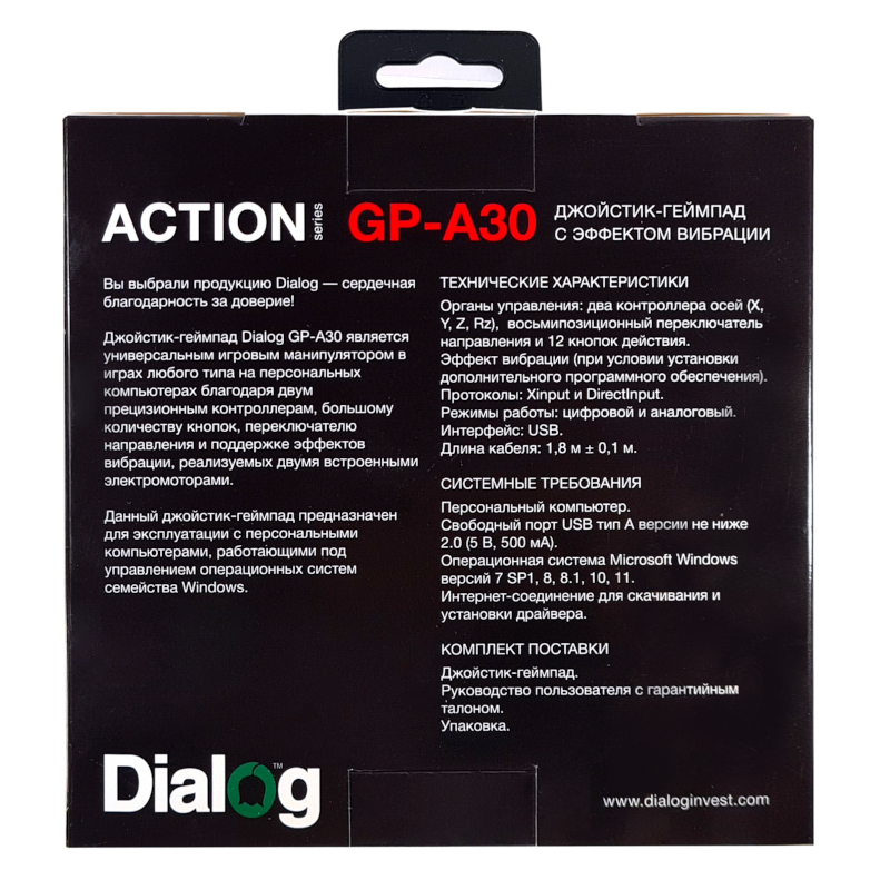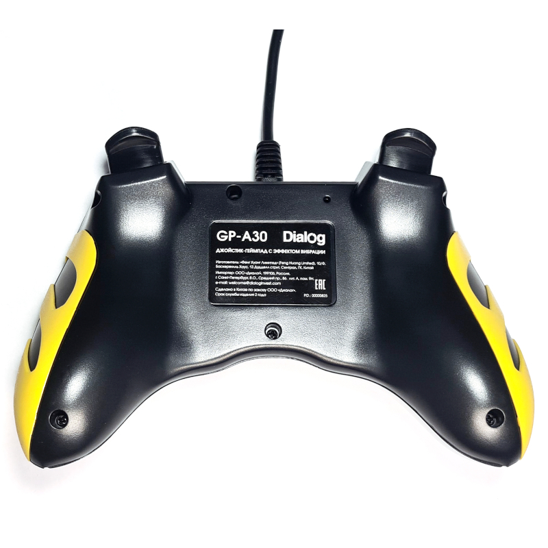 | Геймпад: | GP-A30 | | Цвет: | Чёрный корпус софт-тач с жёлтыми вставками | | Интерфейс: | USB 2.0 | | Режимы работы: | Цифровой и аналоговый | | Органы управления: | Восьмипозиционный переключатель направления, два контроллера осей (X,Y,Z,Rz), кнопки управления | | Количество кнопок управления: | 12 | | Вибрация: | Да | | LED подсветка: | Нет | | Радиоинтерфейс: | Нет | | Длина кабеля: | 1,8м ± 0,1м, кабель в текстильной оплётке | | Отсоединяемый кабель: | Нет | | Минимальные системные требования: | Персональный компьютер: свободный порт USB версии не ниже 2.0 (5В, 500мА). PS3: Свободный порт USB | | Поддерживаемые ОС: | Microsoft Windows XP SP2/SP3, Vista SP2, Windows 7 SP1, 8, 8.1, 10 | | Вес без кабеля, г.: | 185 | | Вес с кабелем, г.: | 221 | | Комплект поставки: | Джойстик-геймпад, руководство пользователя + гарантийный талон, упаковка | | Код ТНВЭД | 8471607000 | | Гарантийный срок, мес. | 6 | | Cрок службы, мес. | 24 |