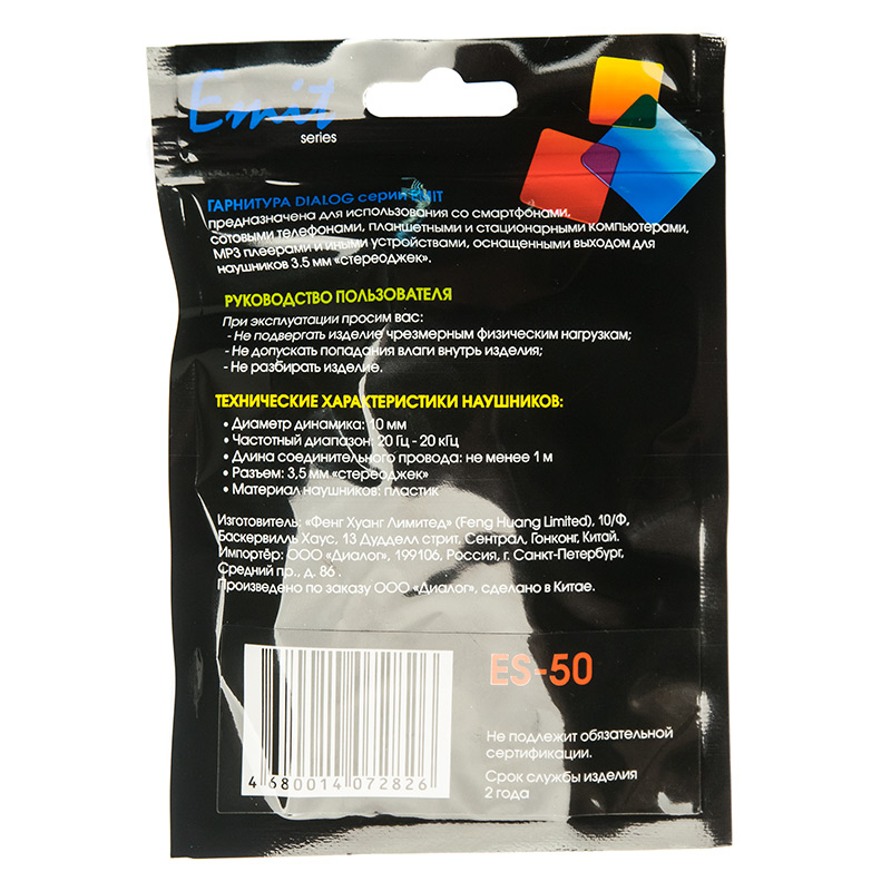 Гарнитура Dialog Emit ES-50| Описание модели | Гарнитура Dialog ES-50 предназначена для использования со смартфонами, сотовыми телефонами, планшетными и стационарными компьютерами, mp3 плеерами и иными устройствами, оснащёнными входом для наушников 3.5мм. | | Технические характеристики | | Модель: | ES-50 | | Управление | многофункциональная кнопка управления, совмещенная с блоком микрофона | | Режим | стерео | | Размер динамика (мм) | 10 | | Частотный диапазон (Гц - кГц) | 20-20 | | Акустическое оформление | вкладыши, канальные | | Амбушюры | силикон, бесцветный | | Кабель | Гибкий плоский черный кабель. Длина: Миниджек: 3,5см, кабель миниджек-микрофон: 92 см, микрофон: 3 см, кабель микрофон-наушник (одинаковая длина до каждого наушника): 28см, наушник: 2,5 см. Полная длина 129 см | | Тип разъема | 3.5 мм TRRS четырехконтактный стереоджек, прямой корпус черного цвета | | Вес наушников с кабелем (г.) | 17 | | Микрофон |