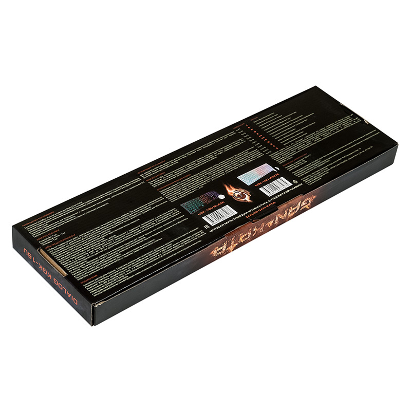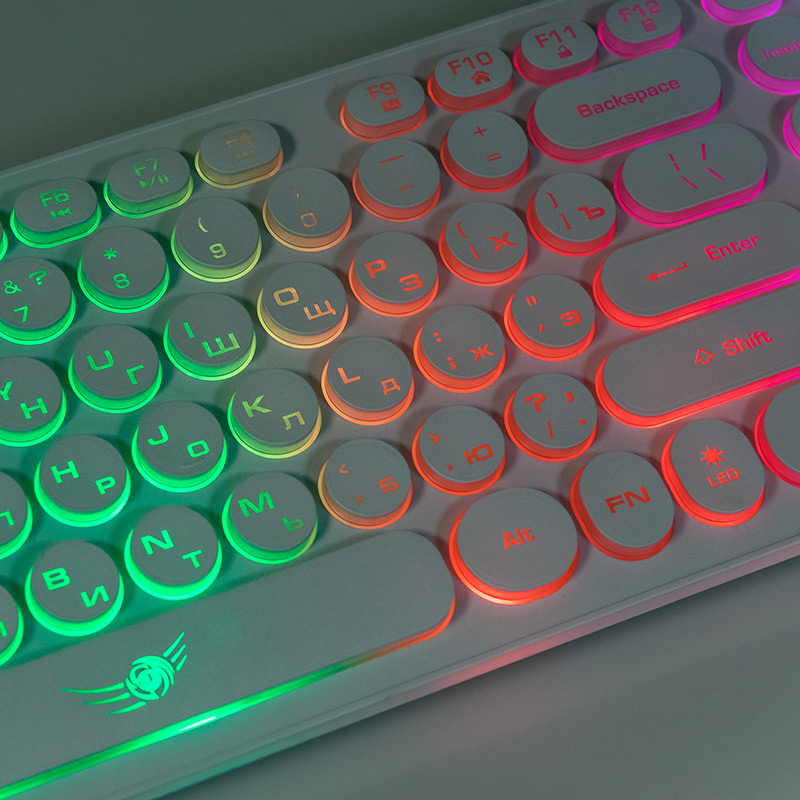Fn+F12: Запуск приложения калькулятора | | Подсветка клавиш | да. Сквозная радужная (многоцветная RGB) подсветка, регулируемая яркость (три уровня яркости). Функция возрастающе-затухающей пульсирующей подсветки. | | Регулируемый угол наклона | да | | Особенности | круглые клавиши островного типа, выступают над основанием на 4.5 мм | | Длина кабеля, м | 1,6±5% | | Габаритные размеры (В*Ш*Г, мм) | 447*125*23 | | Высота клавиатуры от стола: ближняя к пользователю ножка + корпус + клавиша, мм | 19 | | Высота клавиатуры от стола: дальняя от пользователя ножка + корпус + клавиша, мм | 24 | | Высота клавиатуры от стола: дальняя от пользователя выдвинутая ножка + корпус + клавиша, мм | 33 | | Вес (кг) | 0,410 | | Комплект поставки | клавиатура, гарантийный талон, упаковка | | Код ТНВЭД | 8471606000 | | Гарантийный срок, мес. | 6 | | Cрок службы, мес. | 24 |
