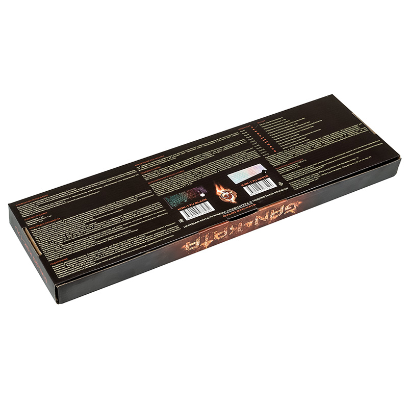 Fn+F12: Запуск приложения калькулятора | | Подсветка клавиш | да. Сквозная радужная (многоцветная RGB) подсветка, регулируемая яркость. Функция возрастающе-затухающей пульсирующей подсветки. | | Регулируемый угол наклона | да | | Особенности | клавиши островного типа с коротким ходом, выступают над основанием на 2 мм | | Длина кабеля, м | 1,6±5% | | Габаритные размеры (В*Ш*Г, мм) | 447*125*23 | | Высота клавиатуры от стола: ближняя к пользователю ножка + корпус + клавиша, мм | 16 | | Высота клавиатуры от стола: дальняя от пользователя ножка + корпус + клавиша, мм | 22 | | Высота клавиатуры от стола: дальняя от пользователя выдвинутая ножка + корпус + клавиша, мм | 32 | | Вес (кг) | 0,410 | | Комплект поставки | клавиатура, гарантийный талон, упаковка | | Код ТНВЭД | 8471606000 | | Гарантийный срок, мес. | 6 | | Cрок службы, мес. | 24 |