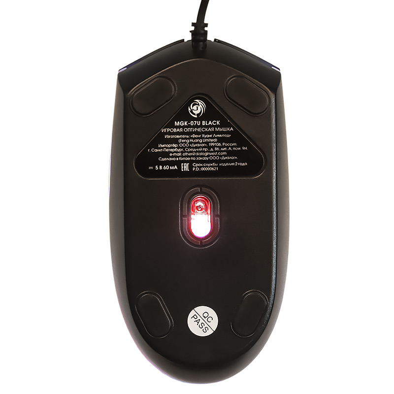 | Модель | MGK-07U Black | | Интерфейс | USB | | Тип | Оптическая (видимый диапазон) | | Разрешение, CPI | 400/800/1200/1600 | | Разрешение по умолчанию, CPI | 1200 | | Динамически изменяемое разрешение | Да | | Кнопка изменения разрешения | DPI | | Изменение разрешения | циклическое | | Материал корпуса | черный пластик, верхняя панель с кнопками - пластик софт-тач. Колёсико прокрутки с ребристым резиновым покрытием | | Подсветка | подсвечивается полоса по периметру мыши и лого Gan-Kata на корпусе. Цвета подсветки меняются циклически: красный, зелёный, синии, фиолетовый | | Количество кнопок | 4 | | Прокрутка | вертикальная | | Особенности модели | Среднекрупная лёгкая симметричная мышь. Подходит как для правшей, так и для левшей. | | Длина кабеля, м | 1,5 | | Размеры (В*Ш*Г, мм), max | 113*60*36 | | Вес нетто, г. (без кабеля/батареек/грузиков и т.п.) | 74 | | Комплект поставки | мышь - 1 шт, гарантийный талон - 1 шт, упаковка - 1 шт | | Код ТНВЭД | 8471607000 | | Гарантийный срок, мес. | 6 | | Cрок службы, мес. | 24 |