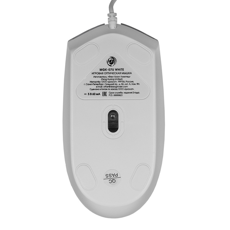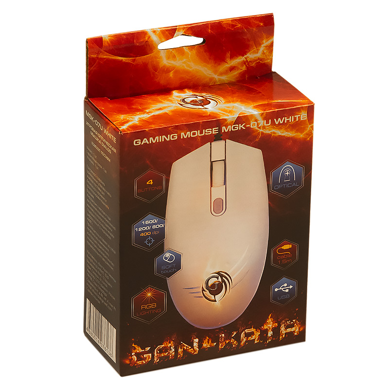 | Модель | MGK-07U White | | Интерфейс | USB | | Тип | Оптическая (видимый диапазон) | | Разрешение, CPI | 400/800/1200/1600 | | Разрешение по умолчанию, CPI | 1200 | | Динамически изменяемое разрешение | Да | | Кнопка изменения разрешения | DPI | | Изменение разрешения | циклическое | | Материал корпуса | белый пластик, верхняя панель с кнопками - пластик софт-тач. Колёсико прокрутки с ребристым резиновым покрытием | | Подсветка | подсвечивается полоса по периметру мыши и лого Gan-Kata на корпусе. Цвета подсветки меняются циклически: красный, зелёный, синии, фиолетовый | | Количество кнопок | 4 | | Прокрутка | вертикальная | | Особенности модели | Среднекрупная лёгкая симметричная мышь. Подходит как для правшей, так и для левшей. | | Длина кабеля, м | 1,5 | | Размеры (В*Ш*Г, мм), max | 113*60*36 | | Вес нетто, г. (без кабеля/батареек/грузиков и т.п.) | 74 | | Комплект поставки | мышь - 1 шт, гарантийный талон - 1 шт, упаковка - 1 шт | | Код ТНВЭД | 8471607000 | | Гарантийный срок, мес. | 6 | | Cрок службы, мес. | 24 |