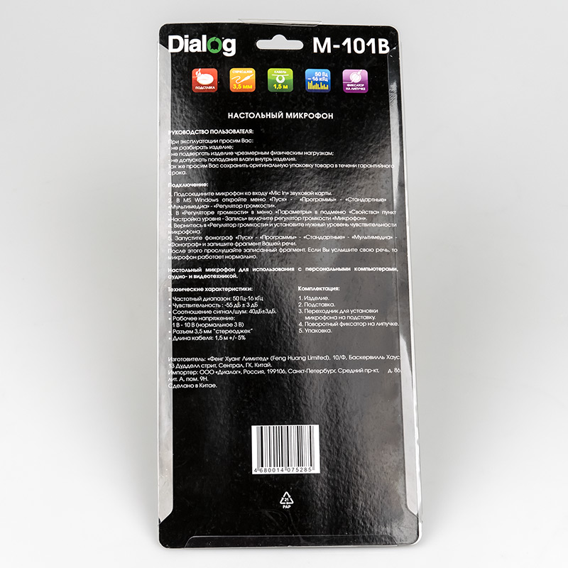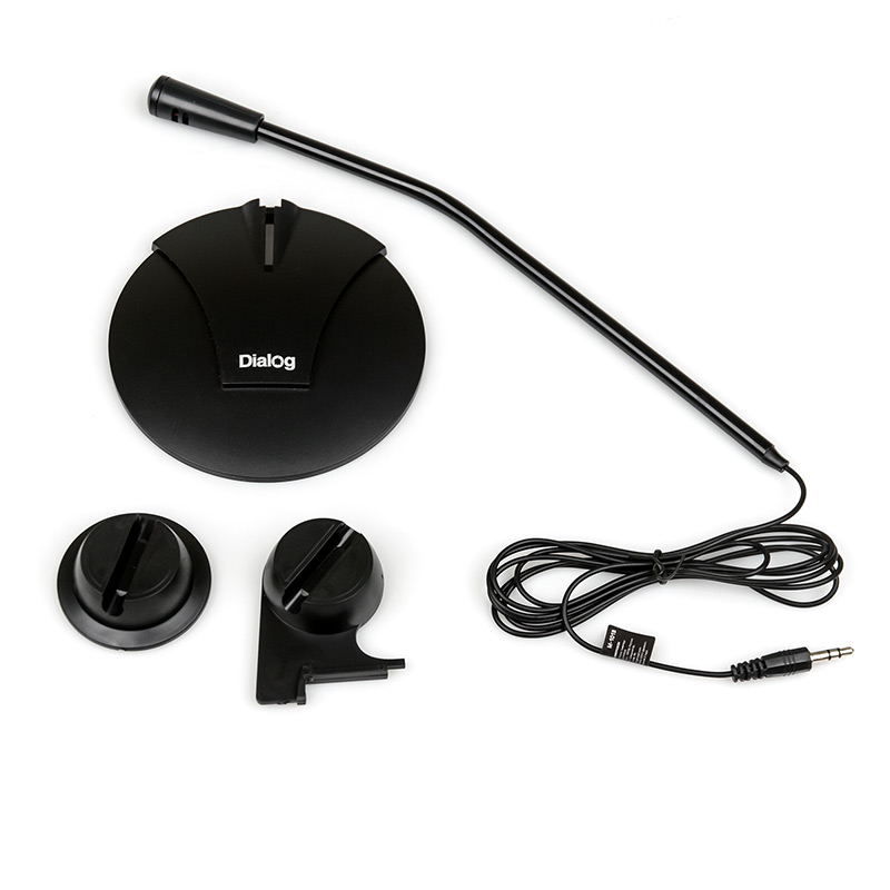 Настольный микрофон на подставке с шарниром и возможностью крепления на монитор или другую вертикальную поверхность Dialog M-101B| Технические характеристики | | Микрофон: | Микрофон DIALOG M-101B | | Тип | конденсаторный | | Режим | моно | | Конструкция | Настольный, ножка на шарнире, с возможностью крепления на монитор. | | Материал корпуса | черный пластик | | Габаритные размеры (В*Ш*Г, мм) | длина ножки 265 мм (ножка не гибкая), диаметр подставки 106 мм | | Вес, г | 48 | | Вес без кабеля, г | 38 | | Чувствительность, дБ | -55 ± 3 | | Частотный диапазон, Гц-КГц | 50-16 | | Соотношение сигнал/шум, дБ | 40 ± 3 | | Рабочее напряжение, В | 1-10 (нормальное 3В) | | Длина кабеля, м | 1,5 ± 5% | | Тип разъема | 3.5 мм миниджек | | Комплект поставки | Микрофон (пластиковая ножка, провод с коннектором 3.5мм), основание-подставка, шарнирный фиксатор микрофона на подставке, дополнительный шарнирный фиксатор микрофона для монитора на липучке, упаковка | | Код ТНВЭД | 8518109500 | | Гарантийный срок, мес. | 6 | | Cрок службы, мес. | 24 |