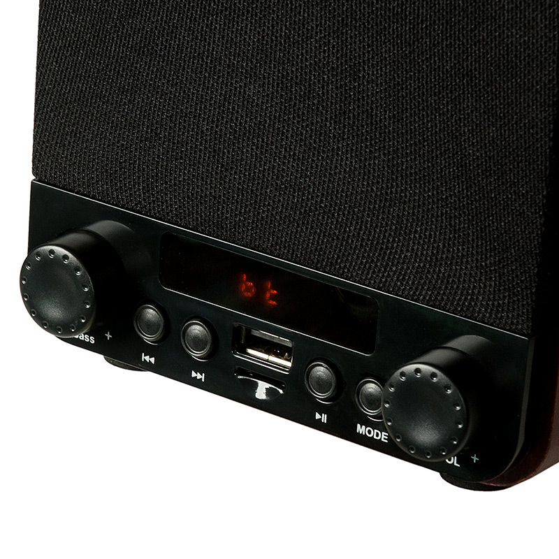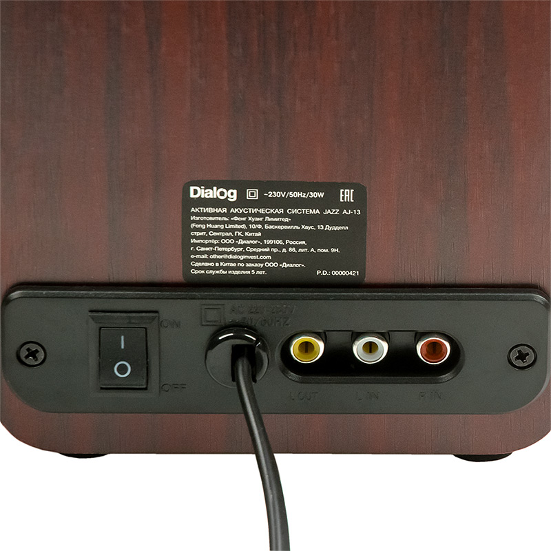 Колонки с Bluetooth и USB Dialog Jazz AJ-13 Brown| Технические характеристики | Модель перенесена в архив 07.10.2023 | | Модель | AJ-13 Brown | | Тип | Настольная / полочная | | Формат | Стерео | | Мощность системы RMS (Вт) | 30 | | Беспроводной интерфейс | Да. Поддержка Bluetooth v5.0 | | Поддержка USB флэш накопителей | Да | | Слот для карт памяти SD (Secure Digital) | Да, MicroSD (TransFlash) | | FM-радиоприемник | нет | | Поддерживаемые тип и размер файловой системы | до 32 Гб, FAT16 или FAT32 | | Поддерживаемые форматы файлов | MPEG-1 Audio Layer 3 (MP3) с битрейтом 64 — 320 Кбит/с, FLAC, WAV, WMA | | Компоненты | активные стереоколонки | | Усилитель | встроенный | | Соотношение сигнал/шум, Дб | > 85 | | Блок питания | Встроенный. Переменный ток 230 В / 50 Гц | | Микрофонный вход | нет | | Выход на наушники | нет | | Управление | на фрональной панели активной колонки: регулятор низких частот, регулятор громкости, предыдущий трек, следующий трек, воспроизведение/пауза, выбор режима; Механический выключатель питания на задней стенке активной колонки | | Пульт ДУ | нет | | Индикация | символьный дисплей, красные символы на тёмном фоне | | Межблочный кабель | Фиксированный в пассивной колонке кабель, подсоединяется к активной колонке через RCA-М коннектор ("колокольчик"), длина 120 см. ±5% | | Длина сетевого кабеля (м) | 130 см. ± 5% | | Динамик(и) | 2*3,5″ | | Мощность (Вт) | 30 | | Сопротивление (Ом) | 4 | | Частотный диапазон (Гц-КГц) | 90-20 | | Фазоинвертор | труба на задней панели, D=22мм, L=100мм | | Корпус | MDF | | Гриль | Несъёмный чёрный текстильный гриль | | Размер корпуса (В*Ш*Г, мм) | 220*124*132 | | Вес (кг) | Активная правая колонка 1,32, пассивная левая колонка 0,96 (вес без кабелей). Общий вес с кабелями питания и межблочным кабелем 2,35 | | Комплект поставки | акустическая система - 1 шт, кабель TRS 3.5 мм миниджек - 2* RCA-M - 1 шт, гарантийный талон - 1 шт, упаковка - 1 шт | | Код ТНВЭД | 8518220009 | | Гарантийный срок, мес. | 12 | | Cрок службы, мес. | 60 |