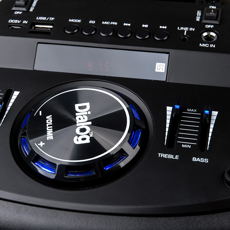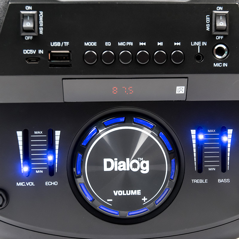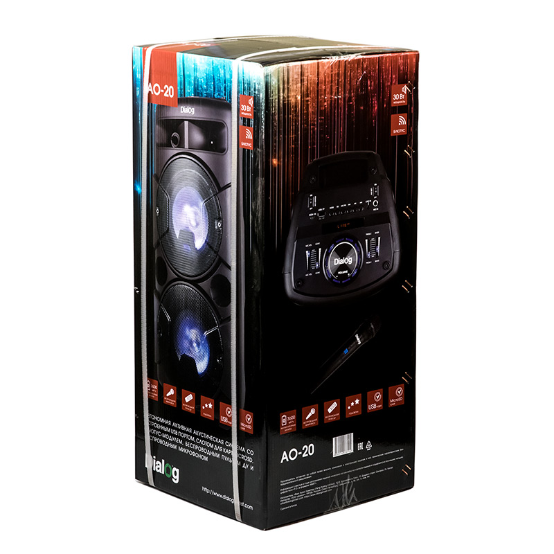 Переносная акустическая система c караоке, Bluetooth, microSD, USB и FM радио Dialog Oscar AO-20| Технические характеристики | Модель перенесена в архив 07.10.2023 | | Модель | AO-20 | | Тип | Напольная переносная | | Формат | Моно | | Мощность системы RMS (Вт) | 30 | | Беспроводной интерфейс | Да. Поддержка Bluetooth | | Поддержка режима TWS | Нет | | Аккумулятор | встроенный Li-Ion аккумулятор 3600 мА*ч | | Поддержка USB флэш накопителей | Да | | Слот для карт памяти SD (Secure Digital) | Да, MicroSD (TransFlash) | | FM-радиоприемник | Да, встроенная антенна | | Поддерживаемые тип и размер файловой системы | до 32 Гб, FAT16 или FAT32 | | Поддерживаемые форматы файлов | MPEG-1 Audio Layer 3 (MP3) с битрейтом 64 — 320 Кбит/с, FLAC, WAV, WMA | | Компоненты | переносная беспроводная акустическая система | | Усилитель | встроенный | | Соотношение сигнал/шум, Дб | 67,5 | | Гармонические искажения | <5% | | Блок питания | Встроенный аккумулятор, питание от внешнего адаптера питания (Постоянный ток 5В), адаптера в комплекте нет, необходимо приобретать отдельно. Штекер питания MicroUSB Type B. Возможна зарядка от USB порта компьютера или от универсального зарядного устройств | | Входы | Line in (миниджек 3.5 мм) | | Микрофонный вход | нет | | Выход на наушники | нет | | Караоке | Да. Есть регуляторы громкости и реверберации (эхо), приоритет микрофона | | Беспроводной микрофон | Да, акустическая система работает с беспроводным микрофоном 263.8 мГц (в комплекте), питание беспроводного микрофона от двух батареек типа АА (LR6, 1.5В, "пальчиковые") | | Проводной микрофон | Да. Один микрофонный вход jack (6,35 мм, 1/4'') | | Управление | на верхней панели: питание вкл/выкл, подсветка вкл/выкл, следующая запись/радиостанция, предыдущая запись/радиостанция, воспроизведение/пауза, выбор режима (источника звука), приоритет микрофона, выбор предустановок эквалайзера; регуляторы: громкость общая, громкость микрофона, эхо микрофона, низкие частоты (Bass), высокие частоты (Treble) | | Индикация | четырехсимвольный дисплей на верхней панели колонки (светящиеся красные символы, тёмный дисплей) | | Цветомузыка | Да, многоцветная цветомузыка, динамическая подсветка обоих динамиков | | Динамик(и) | НЧ 2*6,5″ + ВЧ 1″ | | Мощность (Вт) | 30 | | Сопротивление (Ом) | 3 | | Частотный диапазон (Гц-КГц) | 30-18 | | Фазоинвертор | труба на передней панели (*2) | | Корпус | пластик | | Гриль | Несъемый металлический | | Размер корпуса (В*Ш*Г, мм) | 530*235*225 | | Вес (кг) | 4,00 | | Комплект поставки | акустическая система - 1 шт, кабель питания USB A -> MicroUSB Type B - 1 шт, беспроводной караоке микрофон - 1 шт, ИК пульт ДУ - 1 шт, батарейки ААА для пульта (не перезаряжаемые) - 2 шт, батарейки АА для микрофона (не перезаряжаемые) - 2 шт, руководство пользователя с гарантийным талоном - 1 шт, упаковка - 1 шт | | Код ТНВЭД | 8527919900 | | Гарантийный срок, мес. | 12 | | Cрок службы, мес. | 60 |