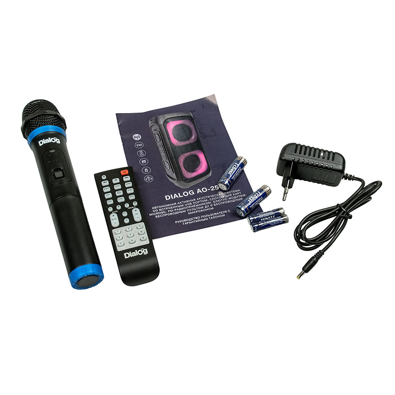 Переносная акустическая система c караоке, Bluetooth, microSD, USB и FM радио Dialog Oscar AO-250| Технические характеристики | | Модель | AO-250 | | Тип | Портативная | | Формат | Моно | | Мощность системы RMS (Вт) | 60 | | Беспроводной интерфейс | Да. Поддержка Bluetooth v5.0 | | Поддержка режима TWS | Да. Можно сформировать стереопару из двух одинаковых колонок. Для этого после включения обеих колонок удерживать на каждой кнопку Play/pause, пока индикатор не отобразит SLAU и начнёт мигать. Сопряжение будет завершено, когда индикатор перестанет мигать | | Аккумулятор | встроенный Li-Ion аккумулятор 3600 мА*ч, 7.4В | | Время работы от батареи | Зависит от громкости, режима использования, температуры окружающей среды. В тестовом режиме при постоянно включенной динамической подсветке, на средней (50%) громкости с использованием FM радио, и частично (около 40 минут) в режиме Bluetooth, при комнатной температуре (около 22°C) акустическая система работала 7 часов 20 минут | | Поддержка USB флэш накопителей | Да | | Слот для карт памяти SD (Secure Digital) | Да, MicroSD (TransFlash) | | FM-радиоприемник | Да, встроенная антенна | | Поддерживаемые тип и размер файловой системы | до 32 Гб, FAT16 или FAT32 | | Поддерживаемые форматы файлов | MPEG-1 Audio Layer 3 (MP3) с битрейтом 64 — 320 Кбит/с, FLAC, WAV, WMA | | Компоненты | переносная беспроводная акустическая система | | Усилитель | встроенный | | Соотношение сигнал/шум, Дб | 67 | | Гармонические искажения | около 1% при мощности 25Вт и полосе 1 кГц | | Блок питания | Встроенный аккумулятор либо питание от внешнего ~220В 50/60Гц адаптера питания: постоянный ток 9В / 2000 мА (в комплекте) | | Входы | AUX Line-in (TRS миниджек 3.5 мм), микрофонный вход TRS джек 6.35 мм (1/4"), вход для электрогитары TRS джек 6.35 мм (1/4"), поддерживается любая электрогитара с выходом TRS джек 6.35мм | | Микрофонный вход | да | | Выход на наушники | нет | | Караоке | Да | | Беспроводной микрофон | Да, акустическая система работает с беспроводным микрофоном 263.8 мГц (в комплекте), питание беспроводного микрофона от двух батареек типа АА (LR6, 1.5В, "пальчиковые") | | Проводной микрофон | Да, 6.35 мм TRS стереоджек для динамического микрофона (в комплекте нет, приобретается отдельно) | | Управление | на верхней панели: выключатель питания, режим подсветки/цветомузыки, следующая запись/радиостанция, предыдущая запись/радиостанция, воспроизведение/пауза/поиск радиостанциий, выбор режима (источника звука). Регуляторы: громкость общая, громкость микрофона | | Пульт ДУ | Да. ИК пульт, 33 кнопки, питание от двух батареек типа ААА | | Индикация | символьный дисплей, белые символы на тёмном фоне. Индикация громкости светодиодной подсветкой вокруг динамиков - высвечивается соответствующая часть окружности | | Цветомузыка | Да, RGB динамическая подсветка на обоих динамиках, режим переключается длительным нажатием на кнопку LIGHT. В режиме цветомузыки работает при воспроизведении через Bluetooth. | | Динамик(и) | 2*6,5″ + 2″ | | Мощность (Вт) | 60 | | Сопротивление (Ом) | 4 | | Частотный диапазон (Гц-КГц) | 40-18 | | Фазоинвертор | труба на задней панели 110*40мм, L=65мм | | Корпус | чёрный пластик | | Гриль | Несъемый металлический гриль чёрного цвета | | Размер корпуса (В*Ш*Г, мм) | 270*600*235 | | Вес (кг) | 6,60 | | Ремень для переноски | Есть, съёмный, регулируемый | | Комплект поставки | акустическая система - 1 шт, адаптер питания ~220В -> 9В 2А - 1 шт, беспроводной караоке микрофон - 1 шт, ИК пульт ДУ - 1 шт, неперезаряжаемые батарейки ААА для пульта ДУ - 2 шт, неперезаряжаемые батарейки АА д