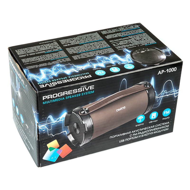 Портативная акустическая система c Bluetooth и USB портом Dialog Progressive AP-1000| Описание модели | Компактная и достаточно лёгкая акустическая система, чтобы взять музыку с собой, куда бы вы не захотели. На дачу, на пикник, на велосипедную прогулку, и так далее. Для удобства транспортировки оснащена надёжной ручкой. Встроенного аккумулятора хватит на два-три часа воспроизведения, в зависимости от способа использования, интенсивности, громкости звука. Оснащена 2.5-дюймовыми динамиками, мощность 16 Вт. Все услышат. Можно воспроизводить mp3 с USB флэшек или любой аудио контент со смартфонов через Bluetooth. | | Технические характеристики | | Модель | AP-1000 | | Тип | Портативная | | Формат | Стерео | | Мощность системы RMS (Вт) | 16 | | Беспроводной интерфейс | Да. Поддержка Bluetooth | | Поддержка режима TWS | Нет | | Аккумулятор | встроенный Li-Ion аккумулятор 1800 мА*ч (3,7В) | | Поддержка USB флэш накопителей | Да | | FM-радиоприемник | Да, встроенная антенна | | Поддерживаемые тип и размер файловой системы | до 32 Гб, FAT16 или FAT32 | | Поддерживаемые форматы файлов | MPEG-1 Audio Layer 3 (MP3) с битрейтом 64 — 320 Кбит/с | | Компоненты | переносная беспроводная акустическая система | | Усилитель | встроенный | | Соотношение сигнал/шум, Дб | > 70 | | Гармонические искажения | не более 1% при мощности 1Вт и полосе 1 кГц | | Блок питания | Встроенный аккумулятор либо питание от USB интерфейса (Постоянный ток 5В / 500 мА) | | Входы | AUX (миниджек 3.5 мм) | | Микрофонный вход | нет | | Выход на наушники | нет | | Управление | питание вкл/выкл, колесико регулировки громкости, кнопки: следующая запись/радиостанция, предыдущая запись/радиостанция, воспроизведение/пауза | | Индикация | светодиод (отображает режим работы) | | Динамик(и) | 2,5″ | | Мощность (Вт) | 8 (в стерео системе два динамика, общая мощность 16 Вт) | | Сопротивление (Ом) | 3 | | Частотный диапазон (Гц-КГц) | 20-20 | | Материал диффузора | бумага | | Магнитное экранирование | экран на динамике | | Корпус | пластик, покрытие софт-тач | | Гриль | Несъемый металлический | | Размер корпуса (В*Ш*Г, мм) | 260*135*132 | | Вес (кг) | 1,140 | | Комплект поставки | акустическая система - 1 шт, кабель TRS 3.5 мм "джек" => 3.5 мм "джек" для подключения к источнику сигнала - 1 шт, кабель для подзарядки аккумулятора USB - Micro USB type B - 1 шт, гарантийный талон - 1 шт, упаковка - 1 шт | | Код ТНВЭД | 8527919900 | | Гарантийный срок, мес. | 12 | | Cрок службы, мес. | 60 |