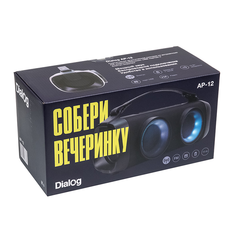 Портативная акустическая система c Bluetooth, USB портом и FM радио Dialog Progressive AP-12| Технические характеристики | Модель перенесена в архив 07.10.2023 | | Модель | AP-12 | | Тип | Портативная | | Формат | Моно | | Мощность системы RMS (Вт) | 15 | | Беспроводной интерфейс | Да. Поддержка Bluetooth v.5.1 | | Поддержка режима TWS | Да. Можно сформировать стереопару из двух одинаковых колонок | | Аккумулятор | встроенный Li-Ion аккумулятор 1500 мА*ч, 3.7В. Время полной зарядки полностью разряженного аккумулятора от адаптера питания 5В 2А - 2 часа 30 минут | | Время работы от батареи | Зависит от громкости, режима использования, температуры окружающей среды. При полном заряде аккумулятора на 50% громкости внутри помещения приблизительно 4 часа 10 минут | | Powerbank режим | Нет | | Поддержка USB флэш накопителей | Да | | Слот для карт памяти SD (Secure Digital) | Нет | | FM-радиоприемник | Да, встроенная антенна | | Поддерживаемые тип и размер файловой системы | до 32 Гб, FAT32 | | Поддерживаемые форматы файлов | MPEG-1 Audio Layer 3 (MP3) с битрейтом 64 — 320 Кбит/с | | Компоненты | переносная беспроводная акустическая система | | Усилитель | встроенный | | Соотношение сигнал/шум, Дб | 60 | | Гармонические искажения | <13% | | Блок питания | Встроенный аккумулятор либо питание от USB интерфейса Type-C (Постоянный ток 5В / 500 мА) | | Входы | AUX Line-in (миниджек 3.5 мм) | | Микрофонный вход | нет | | Выход на наушники | нет | | Караоке | Нет | | Управление | питание вкл/выкл, вкл/выкл. динамической подсветки, воспроизведение/пауза при воспроизведении с флэшки/поиск радиостанций в режиме радио/отключение звука в режиме воспроизведения с линейного входа, переключение источника сигнала, вкл/выкл. режима TWS, следующая запись/радиостанция (увеличение громкости длительным нажатием), предыдущая запись/радиостанция (уменьшение громкости длительным нажатием) | | Пульт ДУ | Нет | | Индикация | Светодиодный индикатор статуса на корпусе | | Цветомузыка | Да, отключаемая RGB цветомузыка/динамическая подсветка на обоих динамиках | | Динамик(и) | 2*2,5″ | | Мощность (Вт) | 15 | | Сопротивление (Ом) | 4 | | Частотный диапазон (Гц-КГц) | 100-12 | | Корпус | пластик | | Гриль | Несъемый металлический гриль чёрного цвета | | Размер корпуса (В*Ш*Г, мм) | 130*301*125 | | Вес (кг) | 1,20 | | Комплект поставки | акустическая система - 1 шт, кабель TRS 3.5мм "джек" => TRS 3.5мм "джек" для подключения к источнику сигнала - 1 шт, кабель для подзарядки аккумулятора USB Type A - Micro USB type C - 1 шт, руководство пользователя с гарантийным талоном - 1 шт, упаковка - 1 шт | | Код ТНВЭД | 8527919900 | | Гарантийный срок, мес. | 12 | | Cрок службы, мес. | 60 |