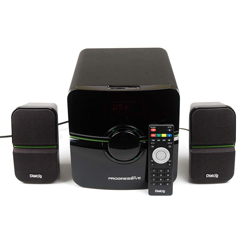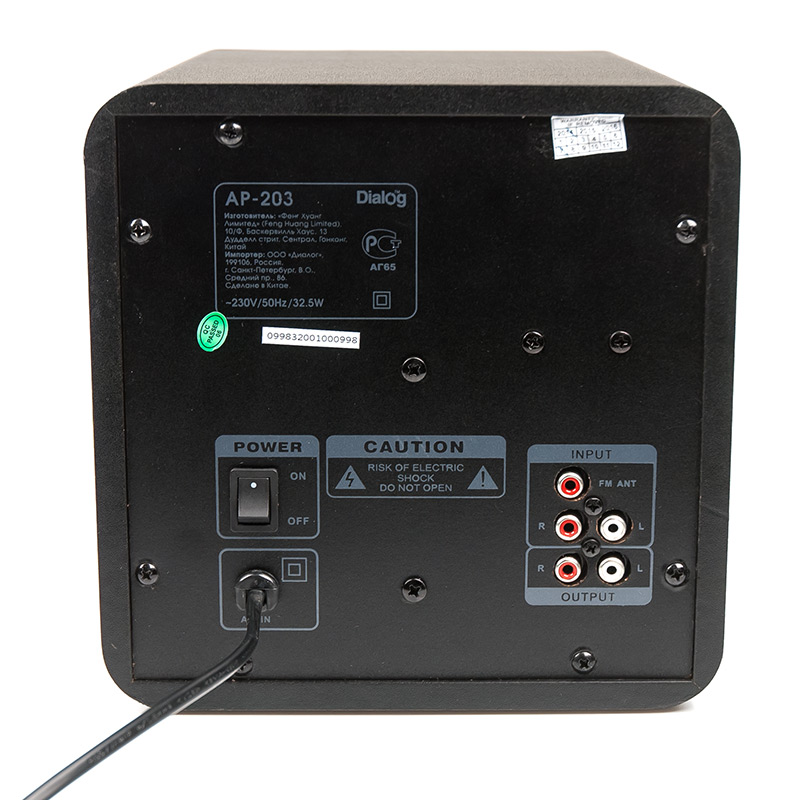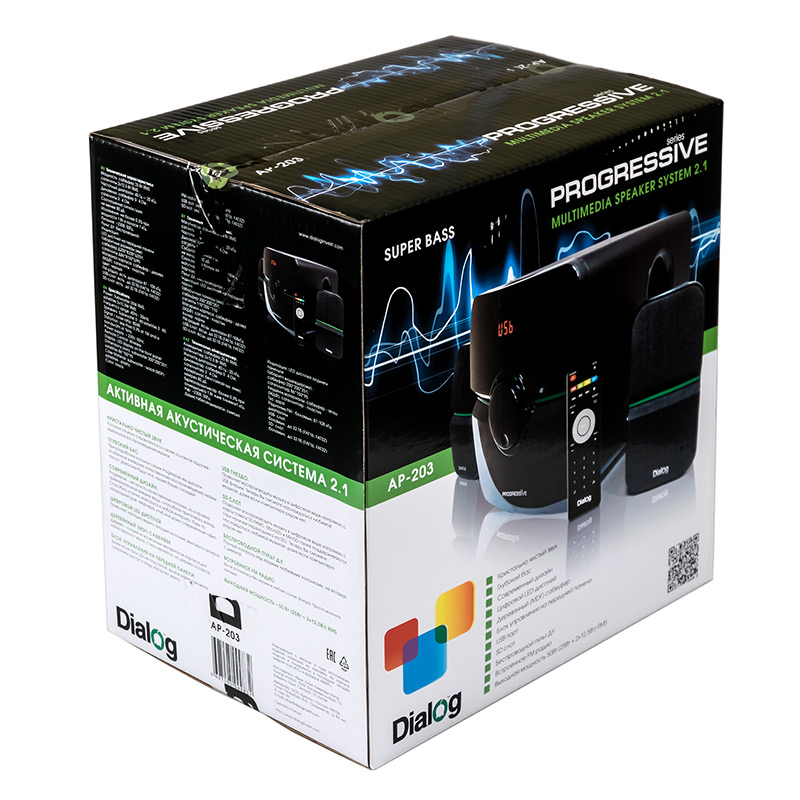 Активная акустическая система 2.1 с Bluetooth Dialog Progressive AP-203| Технические характеристики | | Модель | AP-203 | | Мощность RMS (Вт) | 50 | | Поддержка Bluetooth | Да, только для моделей, произведённых с октября 2020 года включительно. Дату производства см. на стикере на тыловой части сабвуфера в формате P.D.000000000ММГГ, где ММ - месяц (01-12), ГГ - год. | | USB вход | Да | | Поддержка карт SD (Secure Digital) | Да. SD, а также miniSD и microSD (через переходник, приобретаемый отдельно) | | FM радио | Да, память на 20 радиостанций | | Усилитель | встроенный | | Компоненты | сабвуфер, два сателлита | | Соотношение сигнал/шум | >80 | | Гармонические искажения | не более 0.3% при мощности 1 Вт и полосе 1 кГц | | Блок питания | встроенный | | Входы | стереовход (2RCA) | | Управление | сабвуфер: питание, регулятор громкости, переключение источника сигнала, пауза/воспроизведение, вперед/назад (по трекам или радиостанциям); пульт ДУ: подробное описание в руководстве пользователя | | Пульт ДУ | пульт ДУ | | Индикация | четырехсимвольный дисплей на сабвуфере | | Длина сетевого кабеля (м) | 1,5 | | Сабвуфер | | | Динамик(и) | 5″ | | Мощность (Вт) | 25 | | Сопротивление (Ом) | 4 | | Частотный диапазон (Гц-Гц) | от 40 Гц | | Материал диффузора | бумага | | Фазоинвертор | труба-воронка на боковой панели | | Магнитное экранирование | да | | Корпус | MDF, 9 мм | | Габаритные размеры (В*Ш*Г, мм) | 275*200*200 | | Вес (кг) | 3,4 | | Сателлиты | | | Динамик(и) | 3″ | | Мощность (Вт) | 12,5 | | Сопротивление (Ом) | 4 | | Частотный диапазон (Гц-КГц) | до 20 кГц | | Материал диффузора | бумага | | Магнитное экранирование | да | | Корпус | пластик | | Гриль | несъемный, текстильный, черный, с декоративной вставкой | | Габаритные размеры (В*Ш*Г, мм) | 85*95*145 | | Вес (кг) | 0,30 | | Комплект поставки | сабвуфер, два сателлита, кабель для подключения к источнику сигнала 2RCA->3.5 мм стерео джек, беспроводной пульт ДУ, руководство пользователя, гарантийный талон, упаковка | | Код ТНВЭД | 8527919900 | | Гарантийный срок, мес. | 12 | | Cрок службы, мес. | 60 |